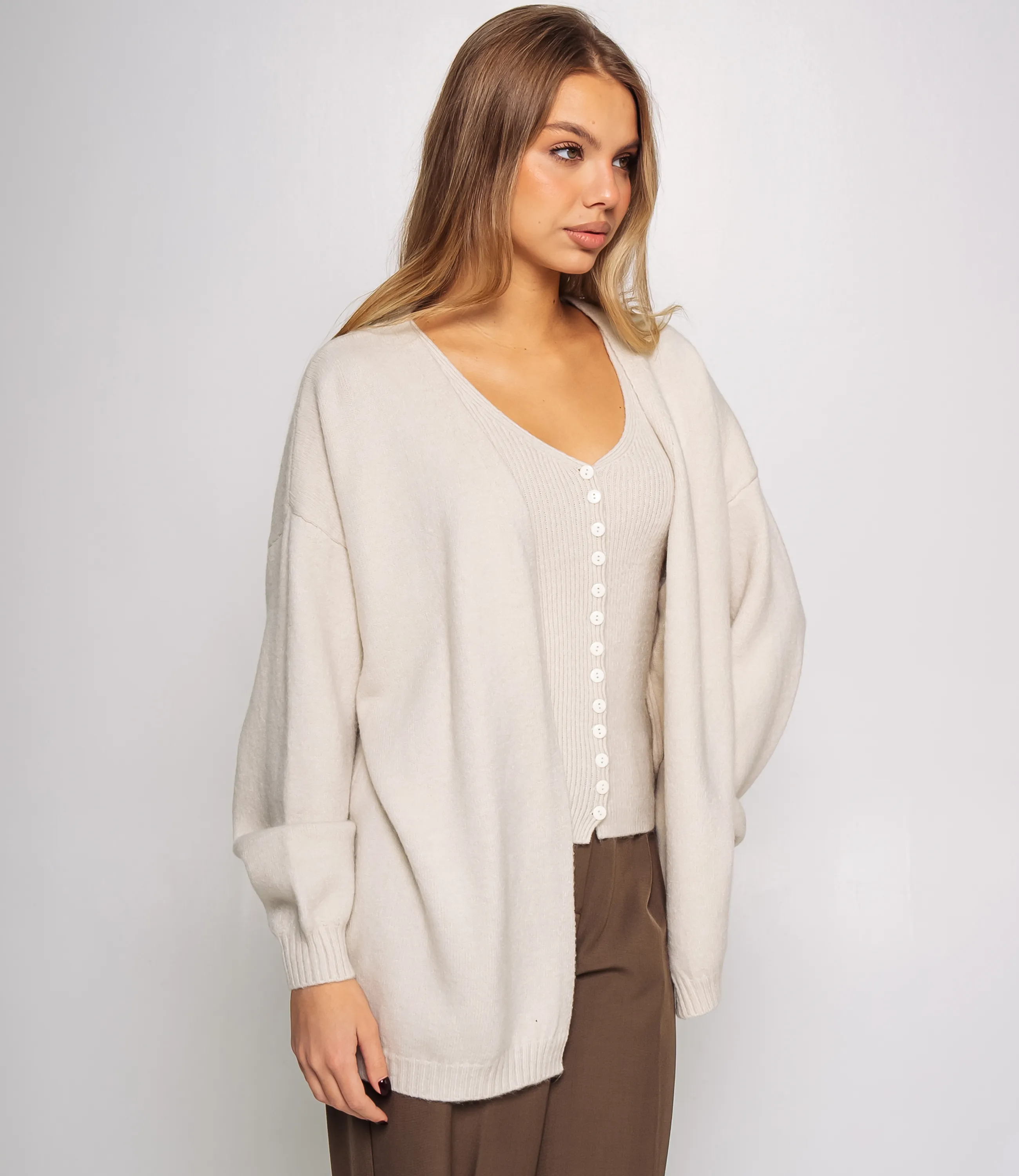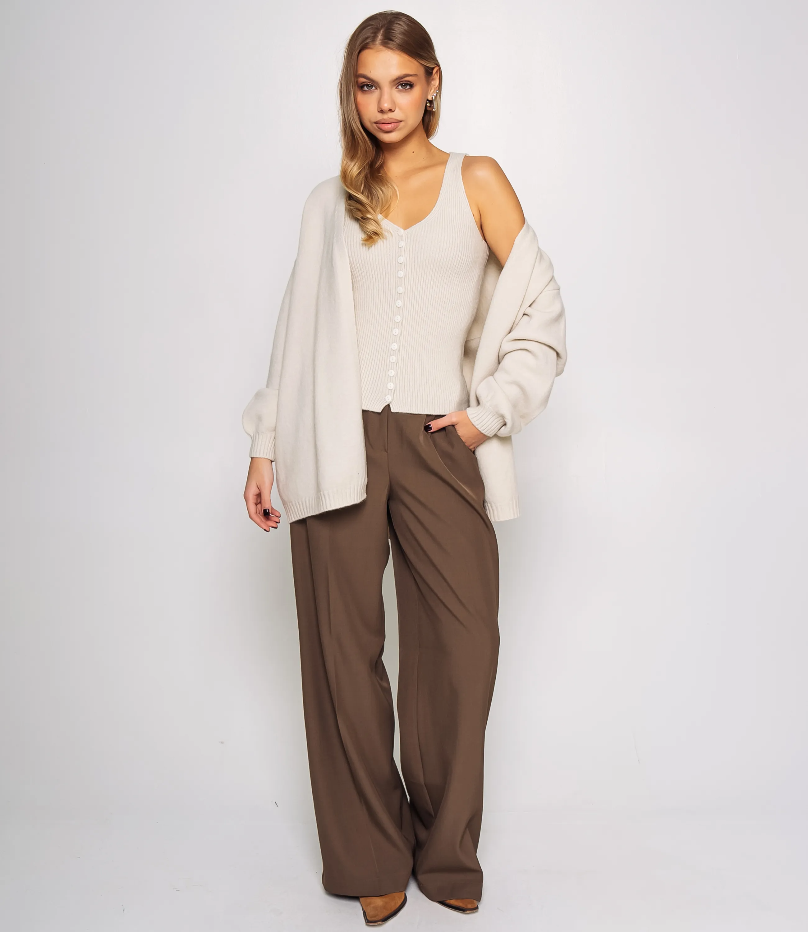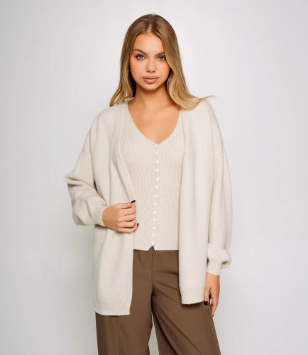 Комплект — это часть гардероба, которая подчёркивает женственность каждой женщины. Модель состоит из удлинённого кардигана свободного кроя, облегающего трикотажного топа на пуговицах с глубоким V‑образным вырезом и свободных брюк прямого кроя с высокой посадкой, что обеспечивает сбалансированный и комфортный образ. Кардиган выполнен из мягкого материала, имеет длинные рукава и манжеты на запястьях, создавая ощущение уюта. Топ сидит по фигуре и подчёркивает силуэт, а брюки добавляют практичности и отлично сочетаются с верхом и разной обувью. Комплект идеально подходит для повседневного ношения в прохладную погоду и соответствует современным модным решениям. Для пошива использована ткань (60% хлопок, 30% акрил, 5% эластан, 5% шерсть), обладающая приятной на ощупь фактурой, хорошей тепло- и износостойкостью. При правильном уходе изделие сохраняет форму и внешний вид даже после многократных стирок, что важно для розничной продажи и снижения возвратов. Цвет и фактура максимально соответствуют фотографии на сайте, что облегчает презентацию товара покупательницам. На странице представлена таблица размеров, позволяющая корректно сформировать ассортимент и минимизировать ошибки при оптовых закупках. Производитель обеспечивает качественную отделку и надёжную фурнитуру. Установленные оптовые условия адекватны и обеспечивают привлекательную маржинальность для магазинов. Рекомендуем включить этот комплект в ассортимент оптовых закупок — он станет востребованным предложением для клиенток, ищущих комфортный, тёплый и стильный повседневный образ. Рост модели 168 см., 89-63-90.