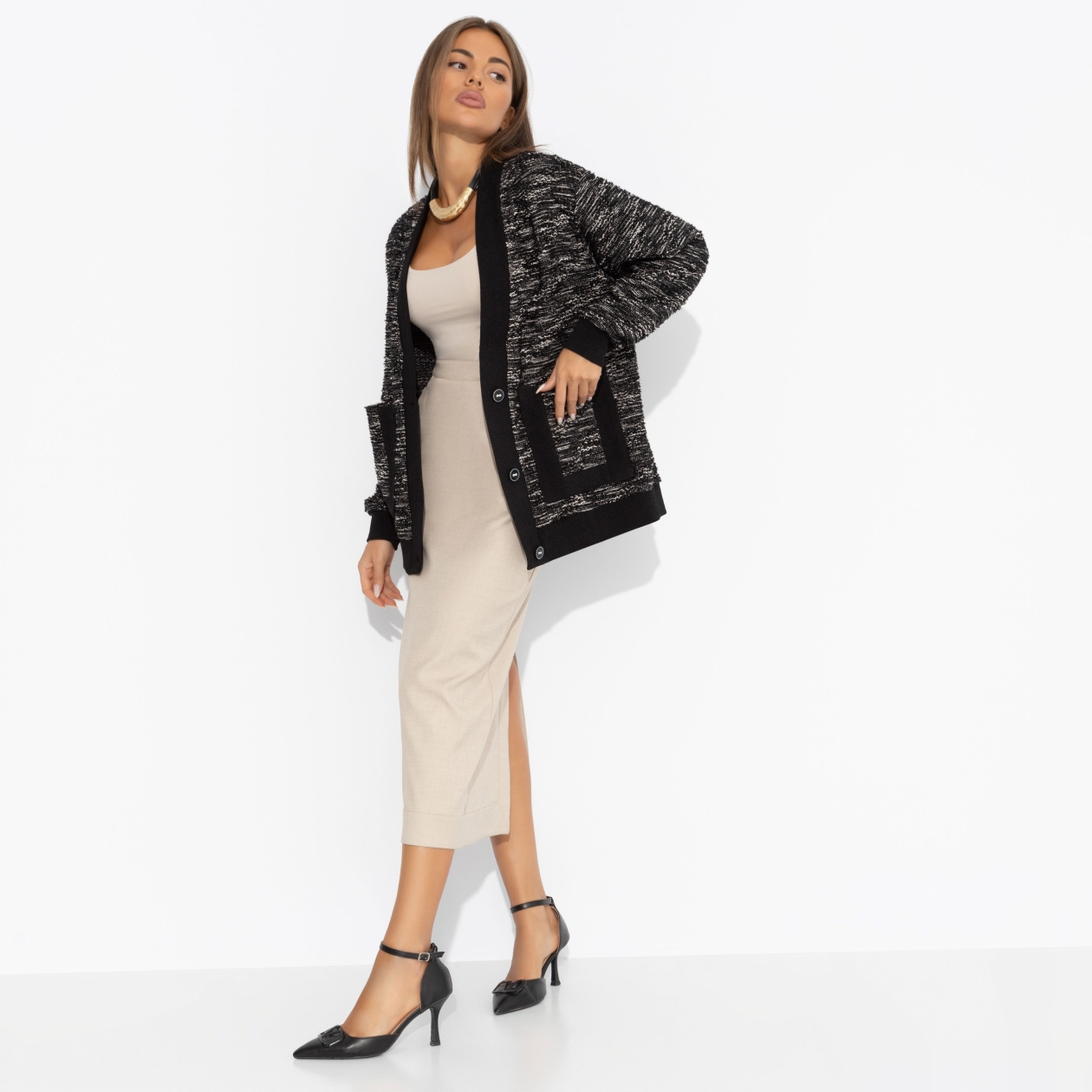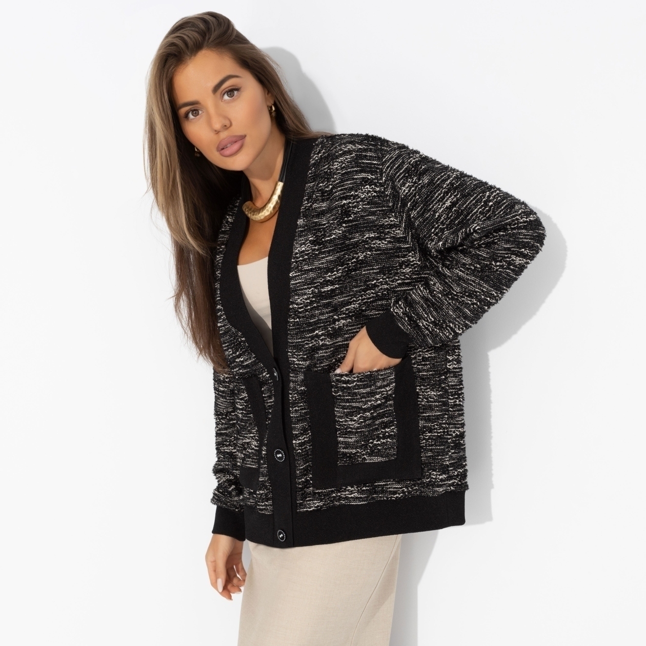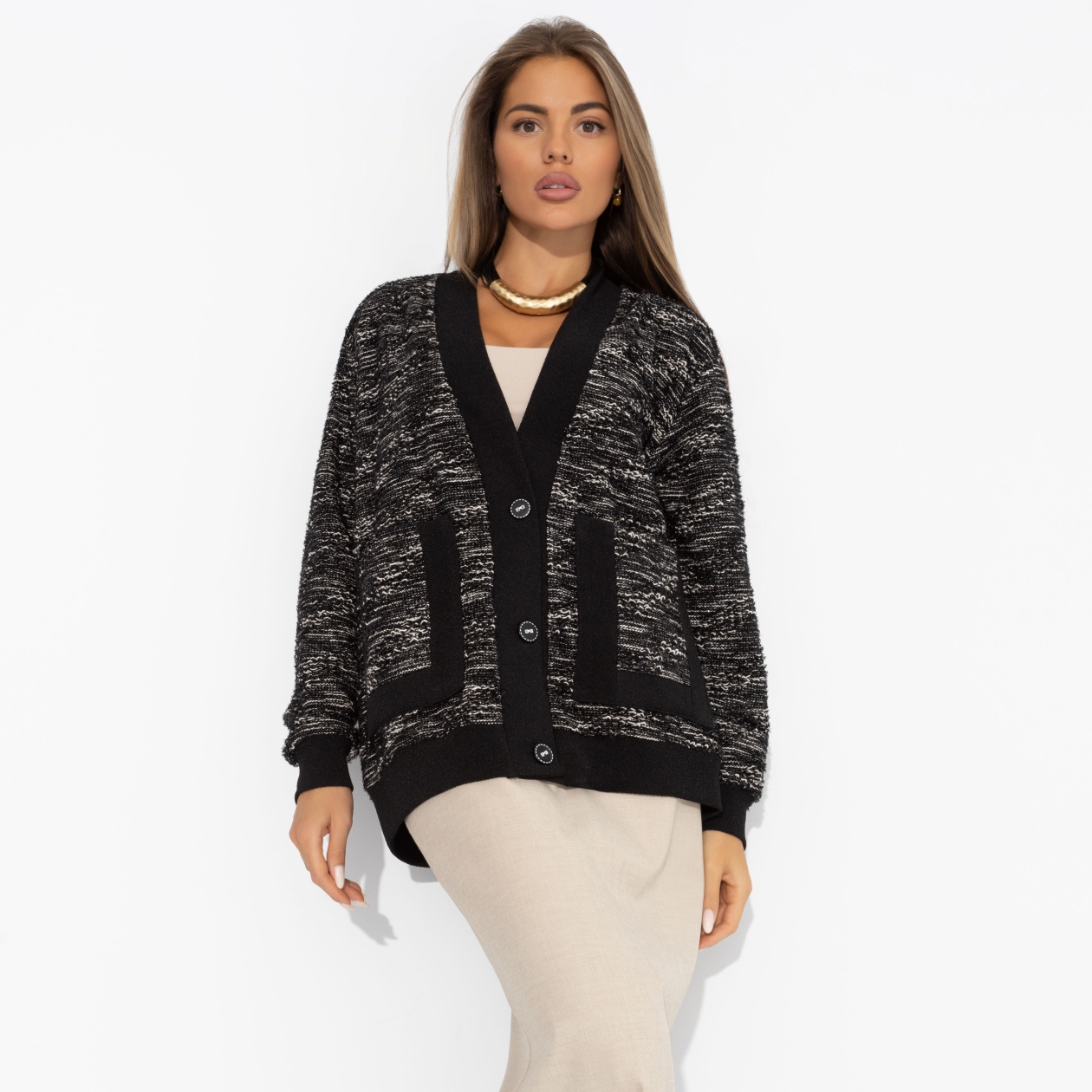 Уютный кардиган ЧАРУТТИ согревает не только тело, но и мысли, напоминая: даже смелые перемены могут быть комфортными, если делать их с собой в гармонии. Контрастные оттенки – символ баланса между прошлым опытом и будущим, которое она теперь выбирает осознанно. Кардиган свободной посадки. Застегивается на пуговицы, с карманами.
