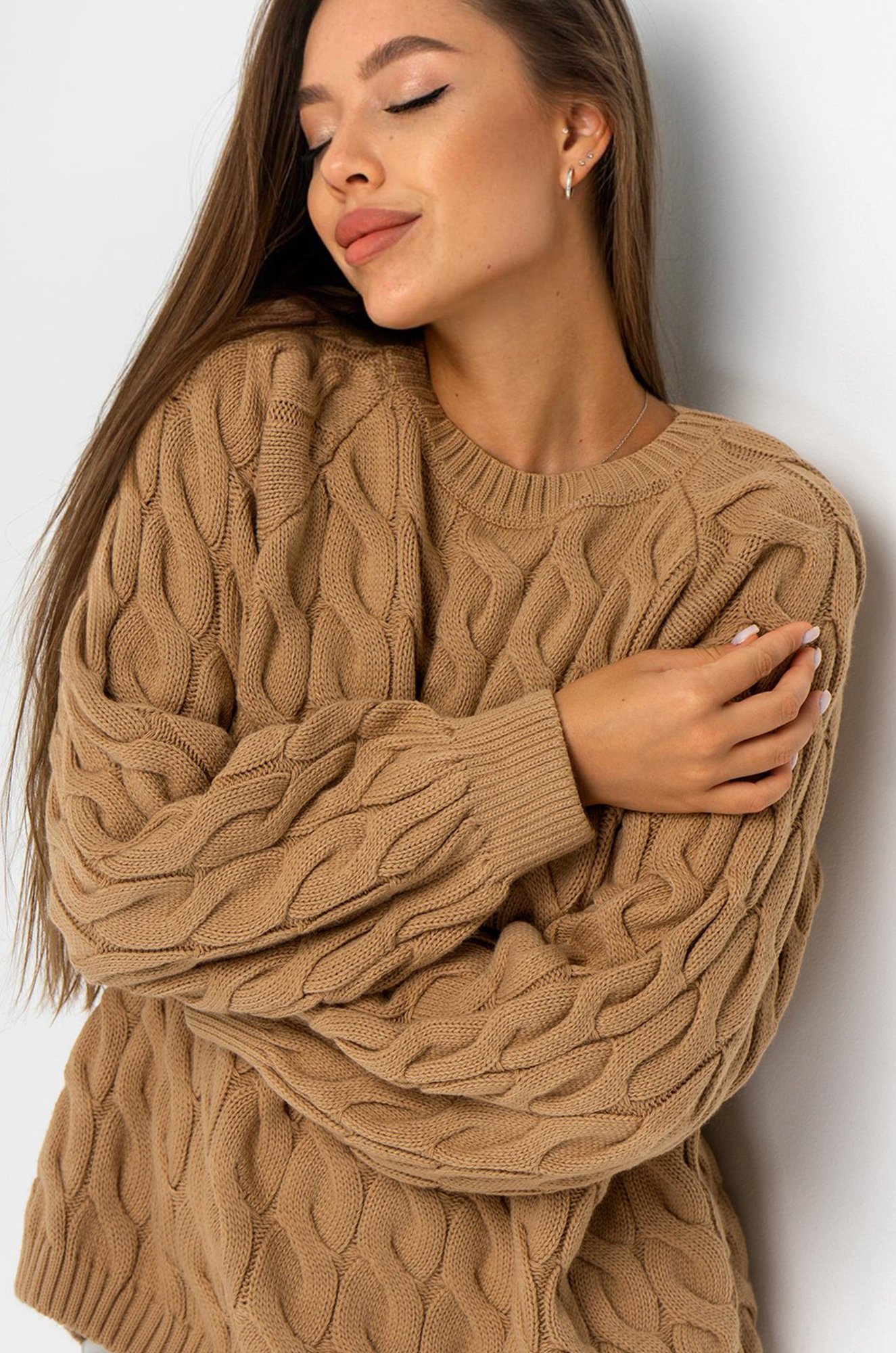 Свободный крой с удлинённым рукавом и крупной вязкой косы создаёт расслабленный и современный вид. Оттенок кэмел придаёт свитеру универсальность и позволяет легко сочетать его с различными оттенками, добавляя нотки нарядности.