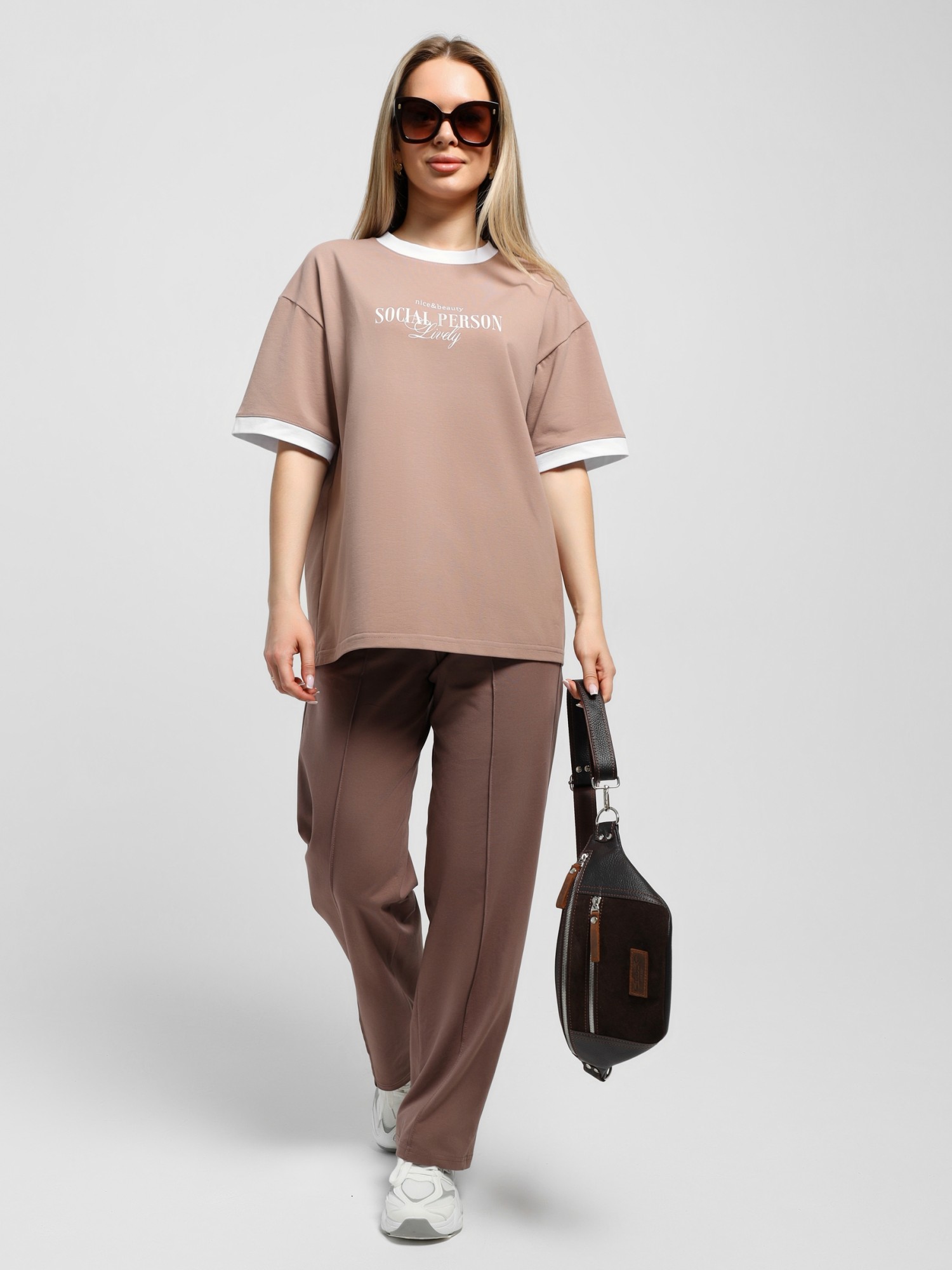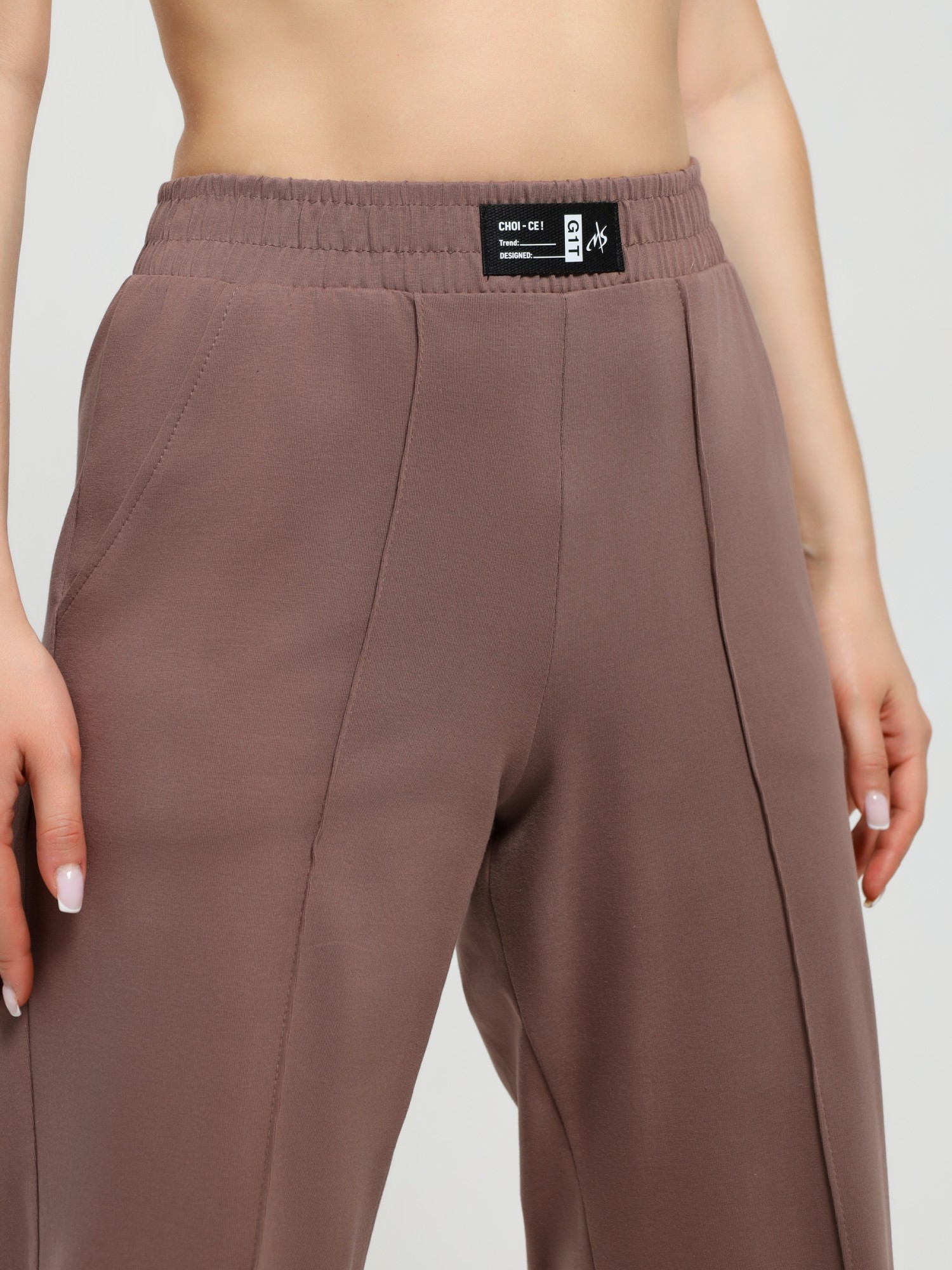 Брюки – из гладкокрашеного трикотажного полотна "кулирка с лайкрой"длинные, классического кроя, на притачном поясе с эластичной тесьмой внутри и карманами в боковых швах. Передние половины брюк застрочены по центральным линиям. По центру пояса настрочен декоративный элемент