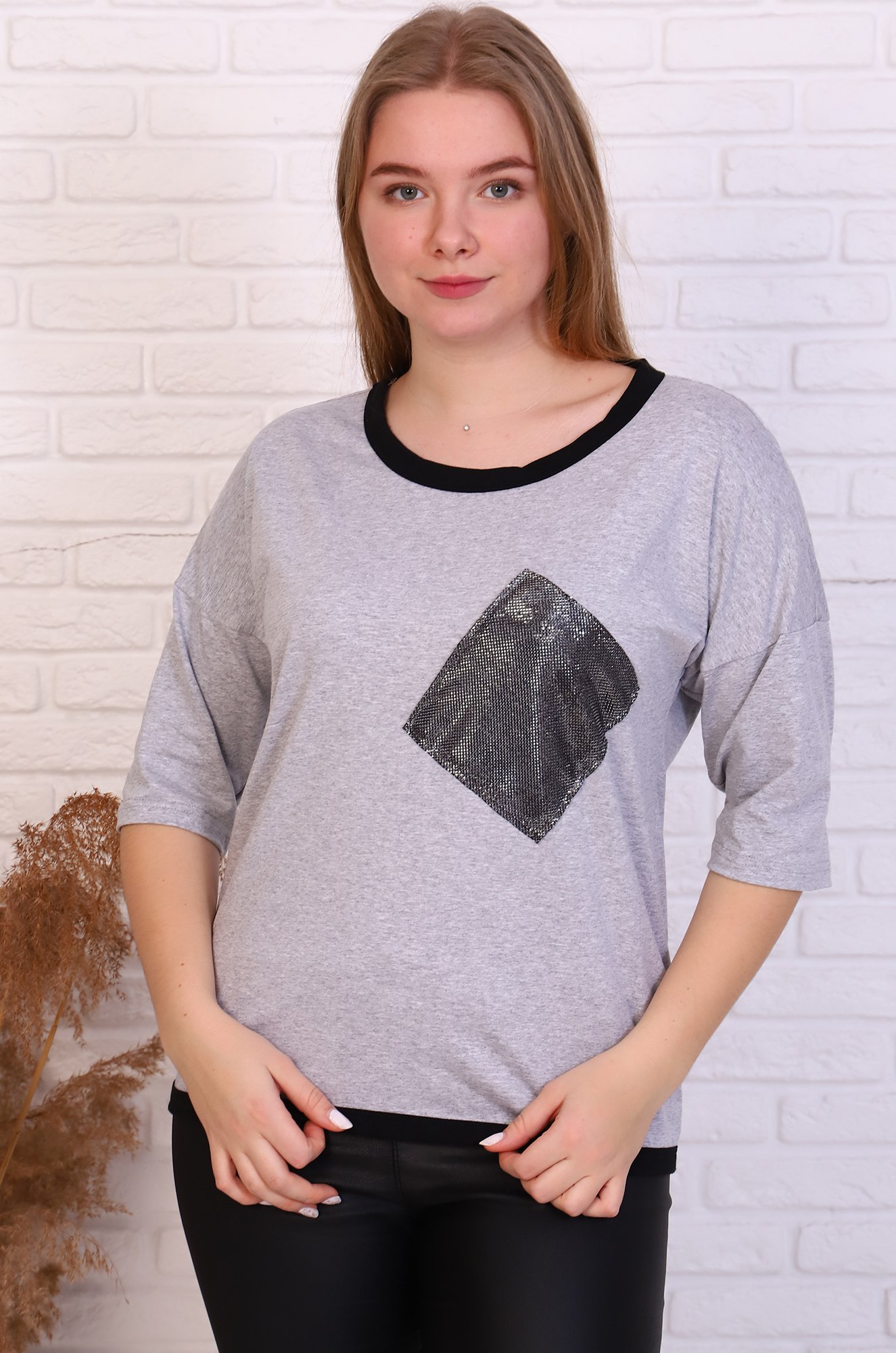 Горловина и низ изделия обработаны контрастным кантом, на груди декоративный блестящий элемент в виде кармана.
