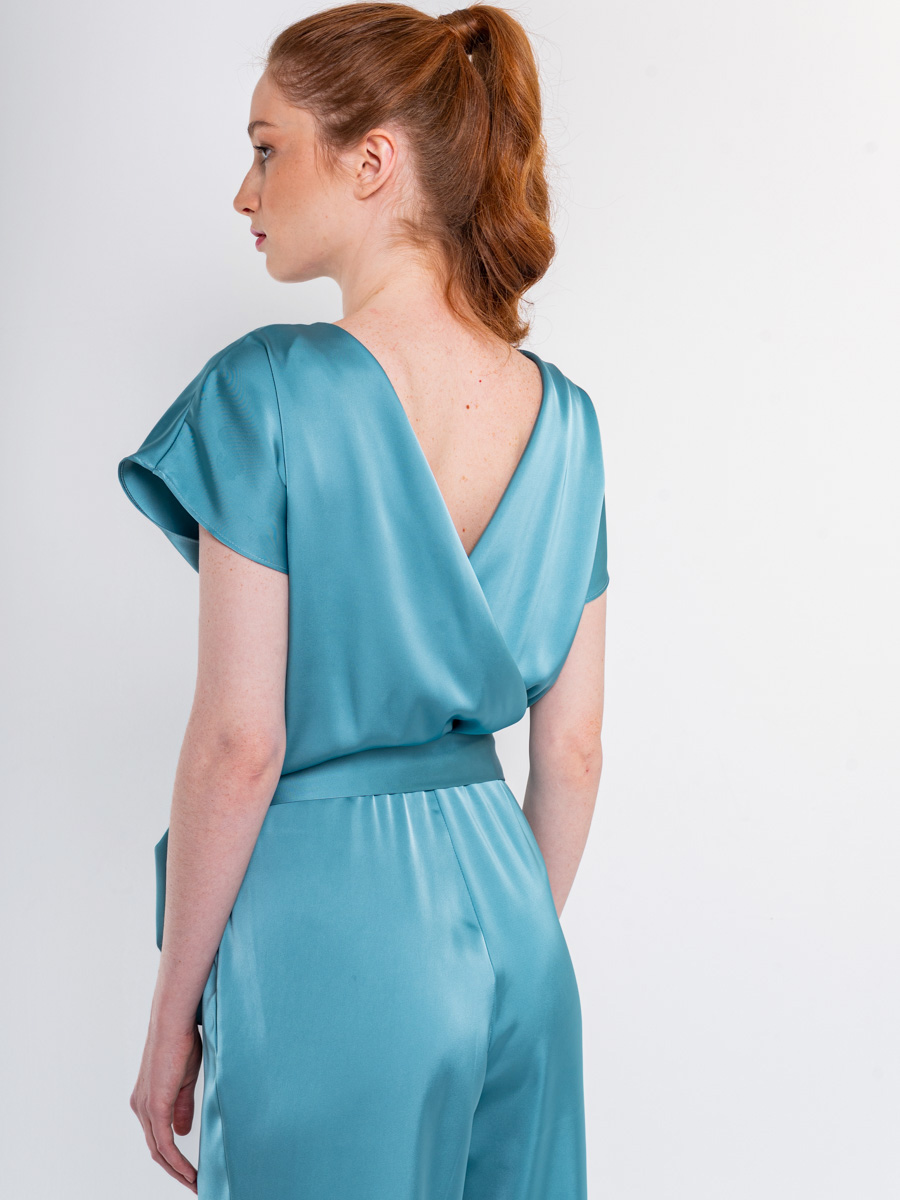 Современные акценты: Интригующая спинка на запах и широкие брюки-палаццо – ключевые модные детали, визуально удлиняющие фигуру и создающие воздушный образ.