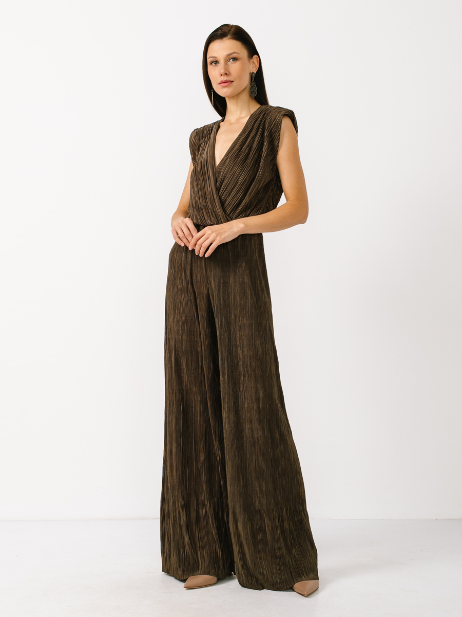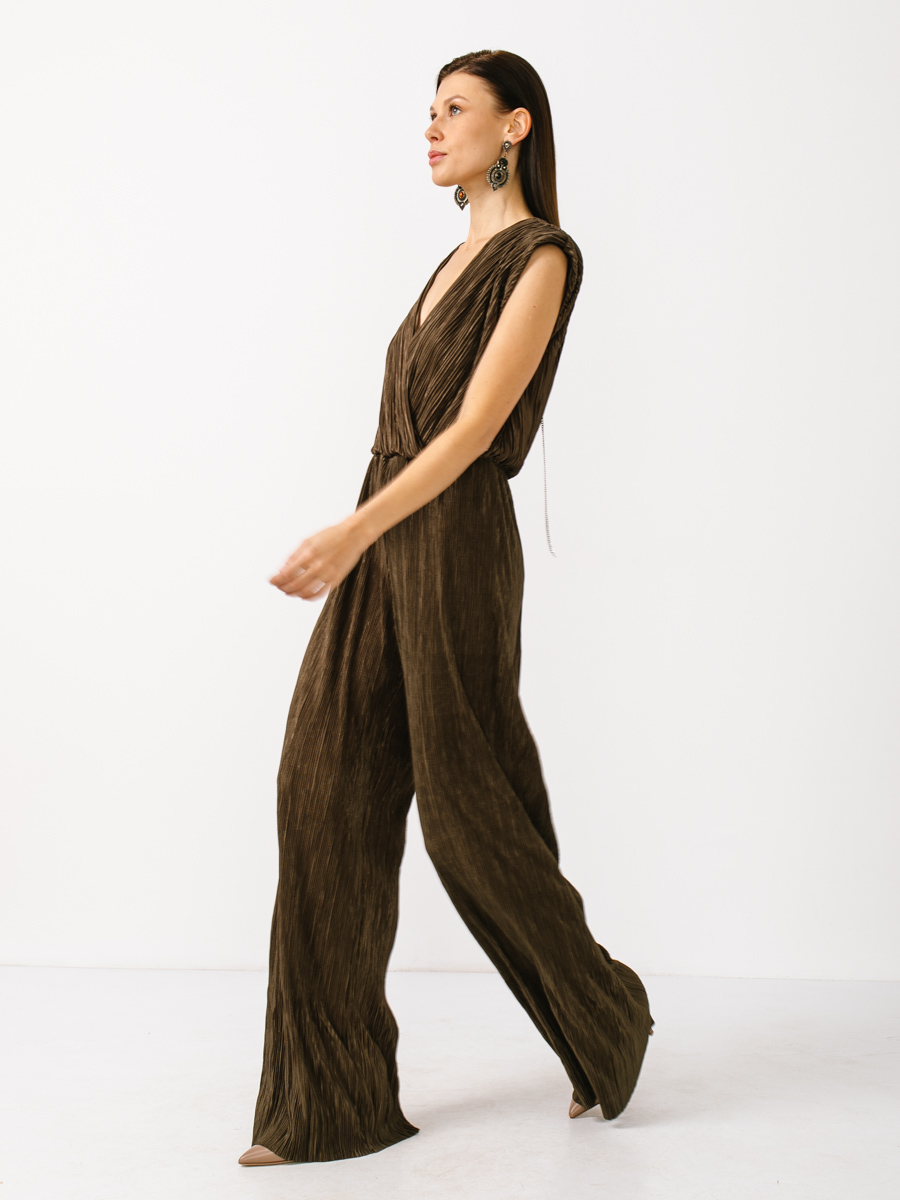 Комбинезон из олднотонной, легкой гофрированной ткани. Без рукавов. Отрезное по линии талии, на резинке. Лиф полочки и спинки на подкладке, на запах. Брюки-палаццо. На спинке цепочка которую можно регулировать. По плечам плечевые накладки. Рост модели 170 см. Изделие на модели 42 р-ра. Длина изделия по спинке 44,9 см. Длина брюк по боковому шву 110,8 см.