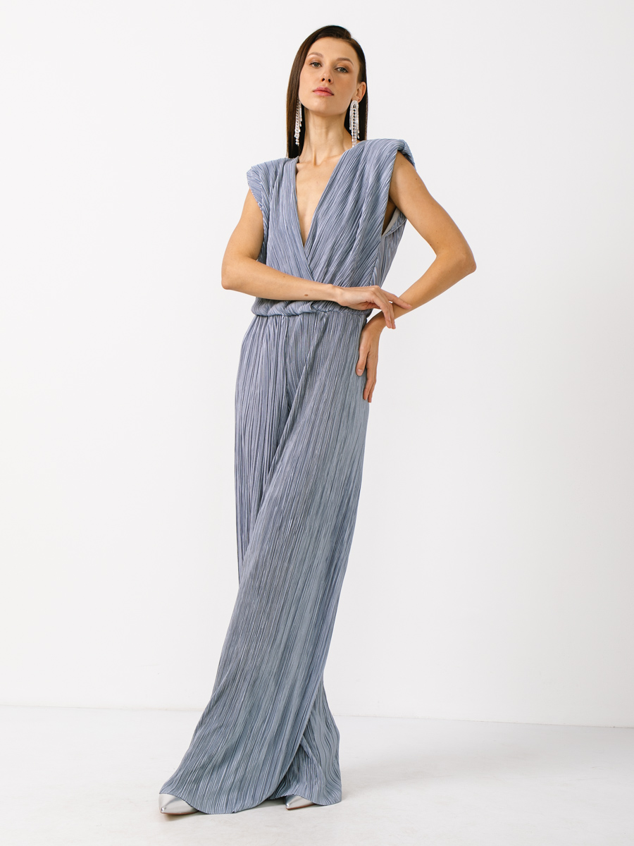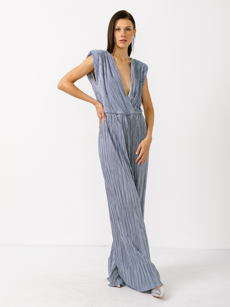 Комбинезон из олднотонной, легкой гофрированной ткани. Без рукавов. Отрезное по линии талии, на резинке. Лиф полочки и спинки на подкладке, на запах. Брюки-палаццо. На спинке цепочка которую можно регулировать. По плечам плечевые накладки. Рост модели 170 см. Изделие на модели 42 р-ра. Длина изделия по спинке 44,9 см. Длина брюк по боковому шву 110,8 см.