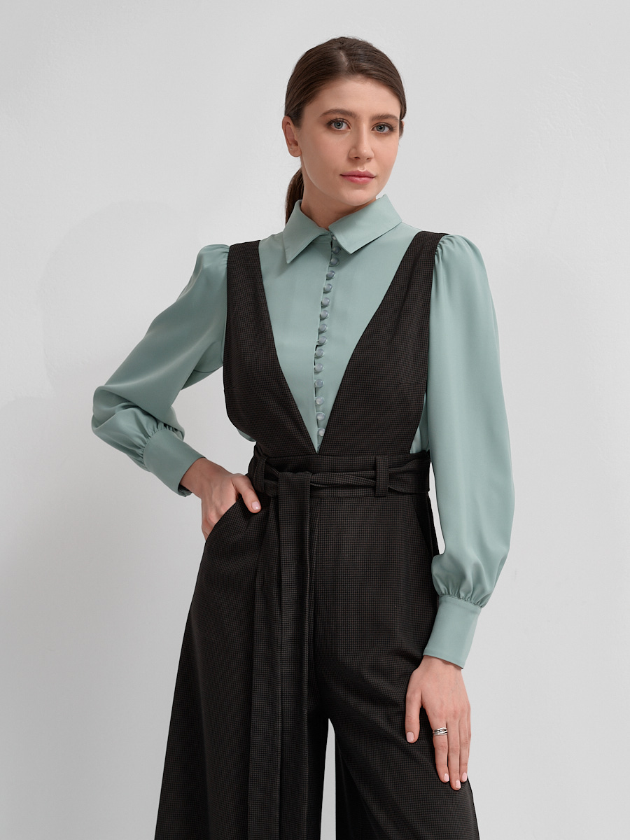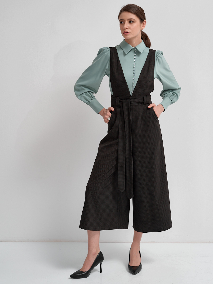 Женский комбинезон из костюмной однотонной ткани и ткани в клетку. Силуэт песочные часы и брюки подчеркнет талию и утонченность. Сдержанные и минималистичные линии лифа и V-образный вырез, подчеркивает стиль. Широкие брюки и карманы в боковых швах позволит чувствовать себя предельно комфортно и уютно. Застежка на потайную молнию. В комплекте съёмный пояс из основной ткани для завершения образа. Превосходство такого Комбинезона скрывается в его разносторонности, позволяя создать практически не ограниченное количество вариантов нарядов.