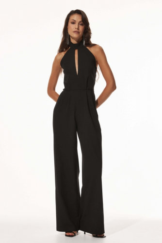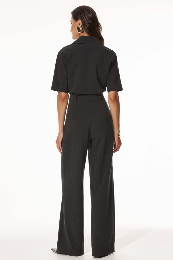 Комбинезон из костюмной поливискозы в графитовом оттенке. Модель приталенная, рукав цельнокроенный укороченный прямой. Воротник английский на запахе. Низ изделия свободный прямой, карманы.