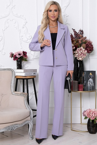 Комплект брючный двух предметный.Брюки с высокой посадкой, прямого силуэта, по поясу эластичная резина,без застежки с имитацией гульфика.Жакет свободного силуэта с центральной застежкой на пуговицы и разрезами в боковых швах.Рукава цельнокроеные с отложной манжетой.Воротник отложной на стойке.Пояс из основной ткани в комплекте.