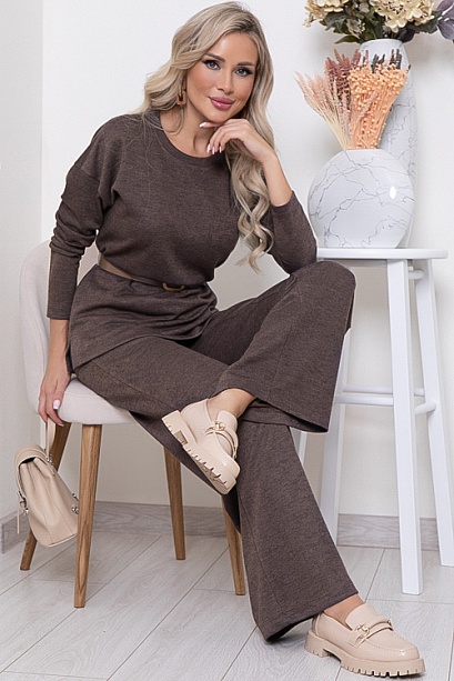 * Брючный комплект из мягкого, комфортного трикотажного полотна. Джемпер свободного силуэта с разрезами по бокам. Брюки свободного силуэта расклешенные к низу,с высокой посадкой и эластичной резиной по поясу.По бокам функциональные карманы. Костюм идеально вариант для спорта, отдыха и прогулок. Ремень в комплект не входит.