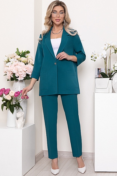 Брючный комплект из костюмной ткани.Жакет свободного силуэта с застежкой на одну пуговицу.Воротник отложной с лацканами.По переду жакета накладные удобные карманы.
