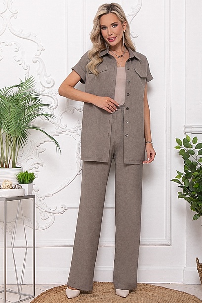 * Комплект брючный двух предметный.Брюки с высокой посадкой, прямого силуэта, по поясу эластичная резина,без застежки с имитацией гульфика.Жакет свободного силуэта с центральной застежкой на пуговицы и разрезами в боковых швах.Рукава цельнокроеные с отложной манжетой.Воротник отложной на стойке.Пояс из основной ткани в комплекте.