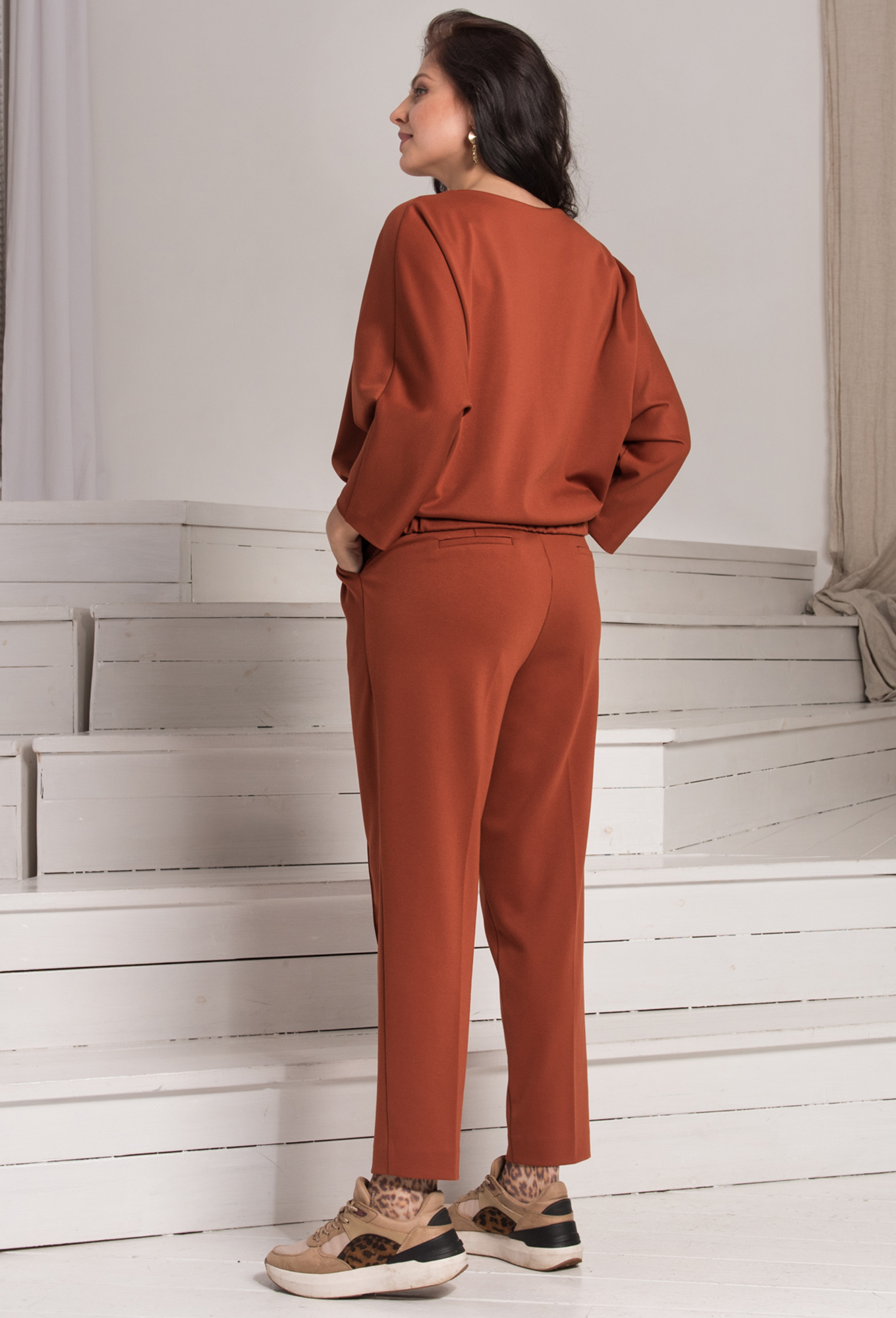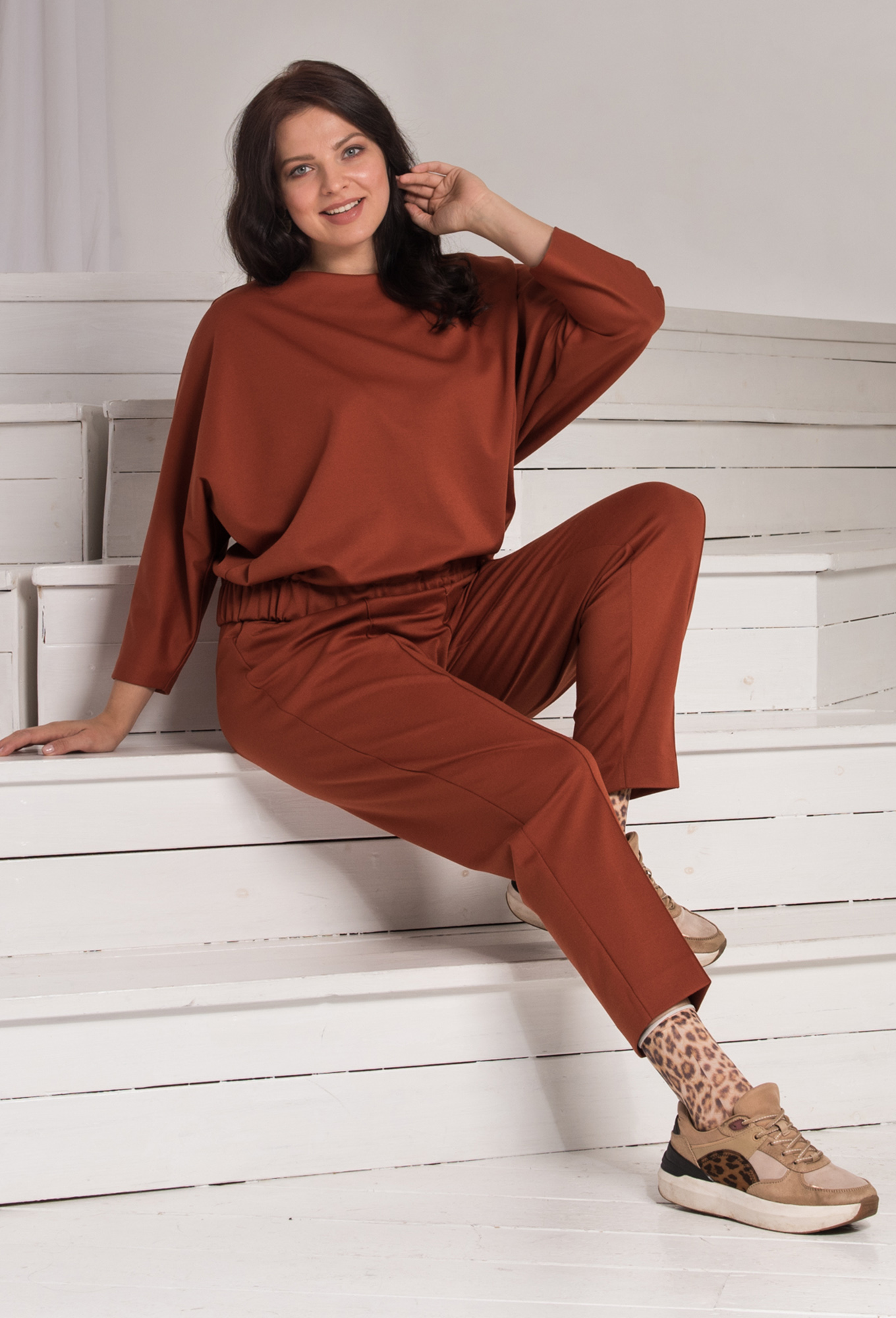 Модель: Амелия Люкс 35-20 терракот ..показатьi>Рост: 164 см (девушка на фото ростом 170см) Сезон: круглогодичный Тип ткани: спандекс 4%, вискоза 68%, п/э 28%Комплект состоит из свитшота и брюк . Свитшот с горловиной лодочка, рукав летучая мышь длиной 7/8. Низ свитшота собран на широкую резинку. Брюки с высокой посадкой ,имеют спокойное облегание в области бедер, к низу обужены. По переду на брюках застрочены стрелки, талия на резинке,на задней части брюк листочки . Длина блузы 60см,длина брюк 98см.i>Рост: 164 см (девушка на фото ростом 170см) Сезон: круглогодичный Тип ткани: спандекс 4%, вискоза 68%, п/э 28%