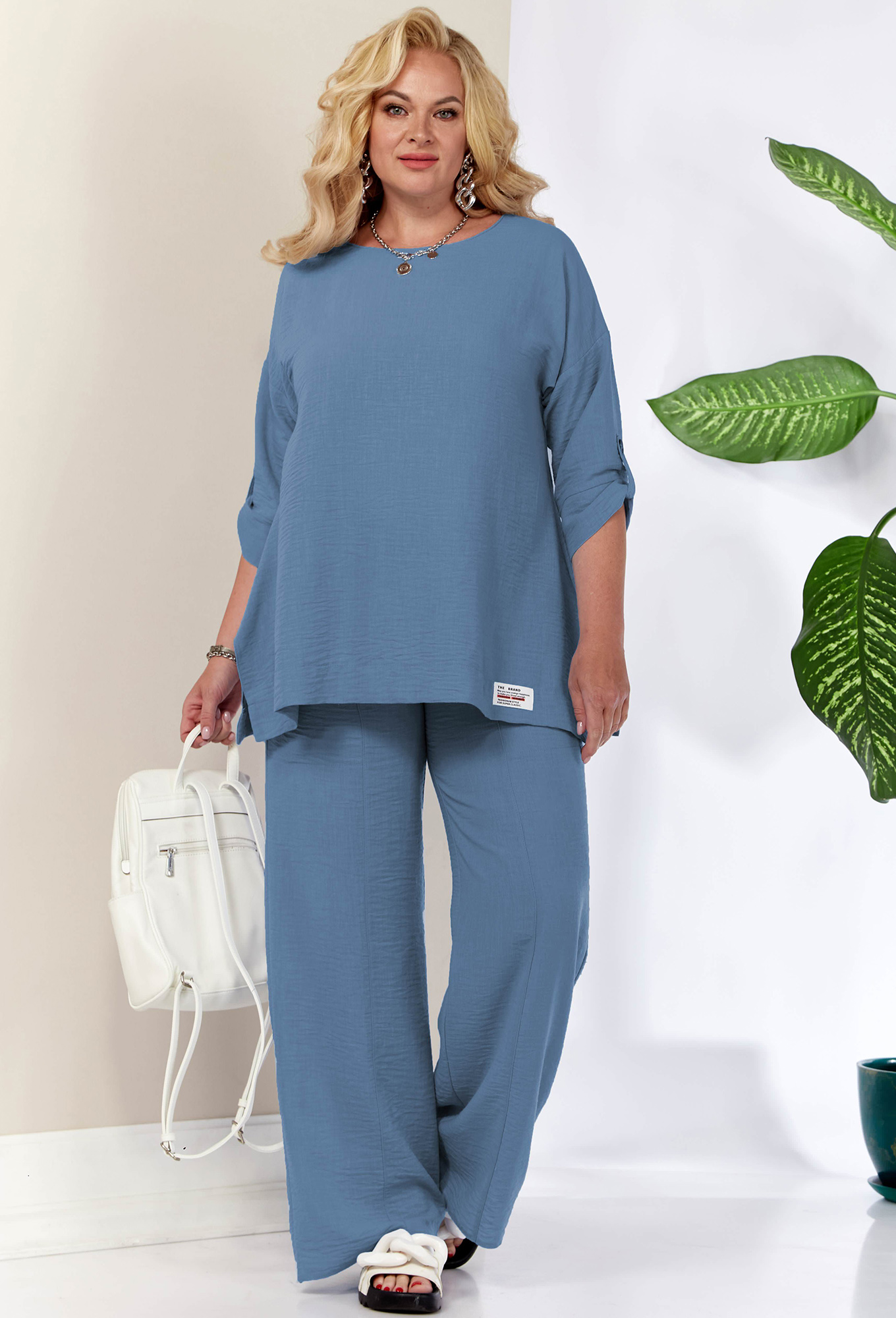 Модель: Анастасия 1102 синий Рост..показать: 164 см (девушка на фото ростом 170см) Сезон: Весна-Лето Тип ткани: Полиэстер - 75%, Лен - 15%, Хлопок - 10%Комплект женский 2-х предметный (блузка, брюки) из тонкой и легкой текстильной ткани- лучший выбор на лето. Отлично подойдет как для повседневной носки (работа, офис, прогулки), так и для праздничных выходов. Достаточно дополнить его соответствующими аксессуарами. Предметы комплекта легко будут сочетаться с вещами из Вашего гардероба. Блузка со спущенным плечом, трапециевидного силуэта с разрезами по бокам. Рукав 3/4 длины с манжетой. Длина рукава фиксируется патой. В качестве декора - нашивка по низу блузки и в верхней части спинки. Брюки прямые, пояс на резинке. По передней части брюк идут подрезы с карманами. Длина по спинке (50-54) - 70 см, (56-60) - 74 см. Длина рукава: (50-60) - 30 см. Длина брюк: (50-54) - 104 см, (56-60) - 107 см.: 164 см (девушка на фото ростом 170см)