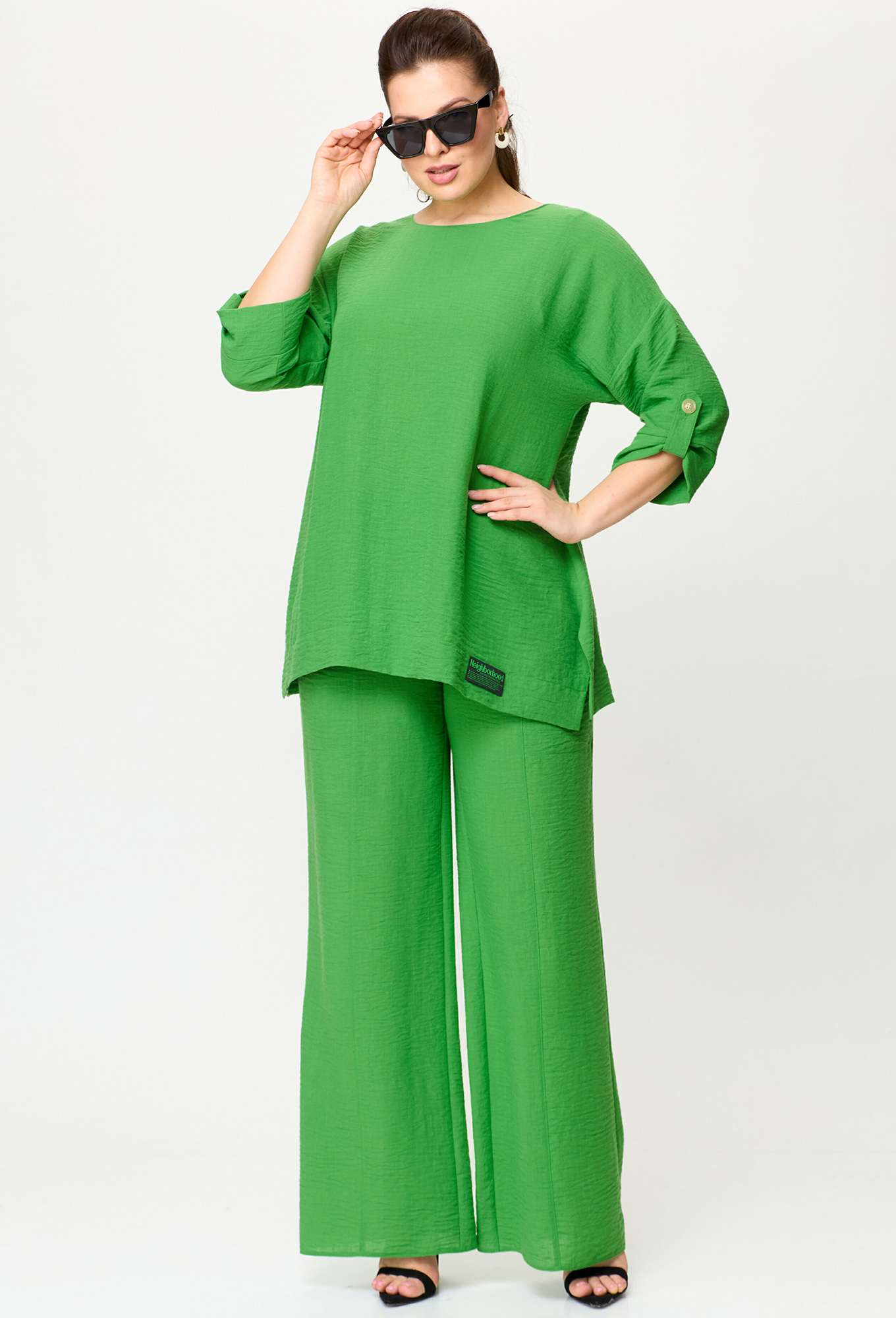 Модель: Анастасия 1102 зелёный Ро..показатьст: 164 см (девушка на фото ростом 170см) Сезон: Весна-Лето Тип ткани: Полиэстер - 75%, Лен - 15%, Хлопок - 10%Комплект женский 2-х предметный (блузка, брюки) из тонкой и легкой текстильной ткани- лучший выбор на лето. Отлично подойдет как для повседневной носки (работа, офис, прогулки), так и для праздничных выходов. Достаточно дополнить его соответствующими аксессуарами. Предметы комплекта легко будут сочетаться с вещами из Вашего гардероба. Блузка со спущенным плечом, трапециевидного силуэта с разрезами по бокам. Рукав 3/4 длины с манжетой. Длина рукава фиксируется патой. В качестве декора - нашивка по низу блузки и в верхней части спинки. Брюки прямые, пояс на резинке. По передней части брюк идут подрезы с карманами. Длина по спинке (50-54) - 70 см, (56-60) - 74 см. Длина рукава: (50-60) - 30 см. Длина брюк: (50-54) - 104 см, (56-60) - 107 см.ст: 164 см (девушка на фото ростом 170см)
