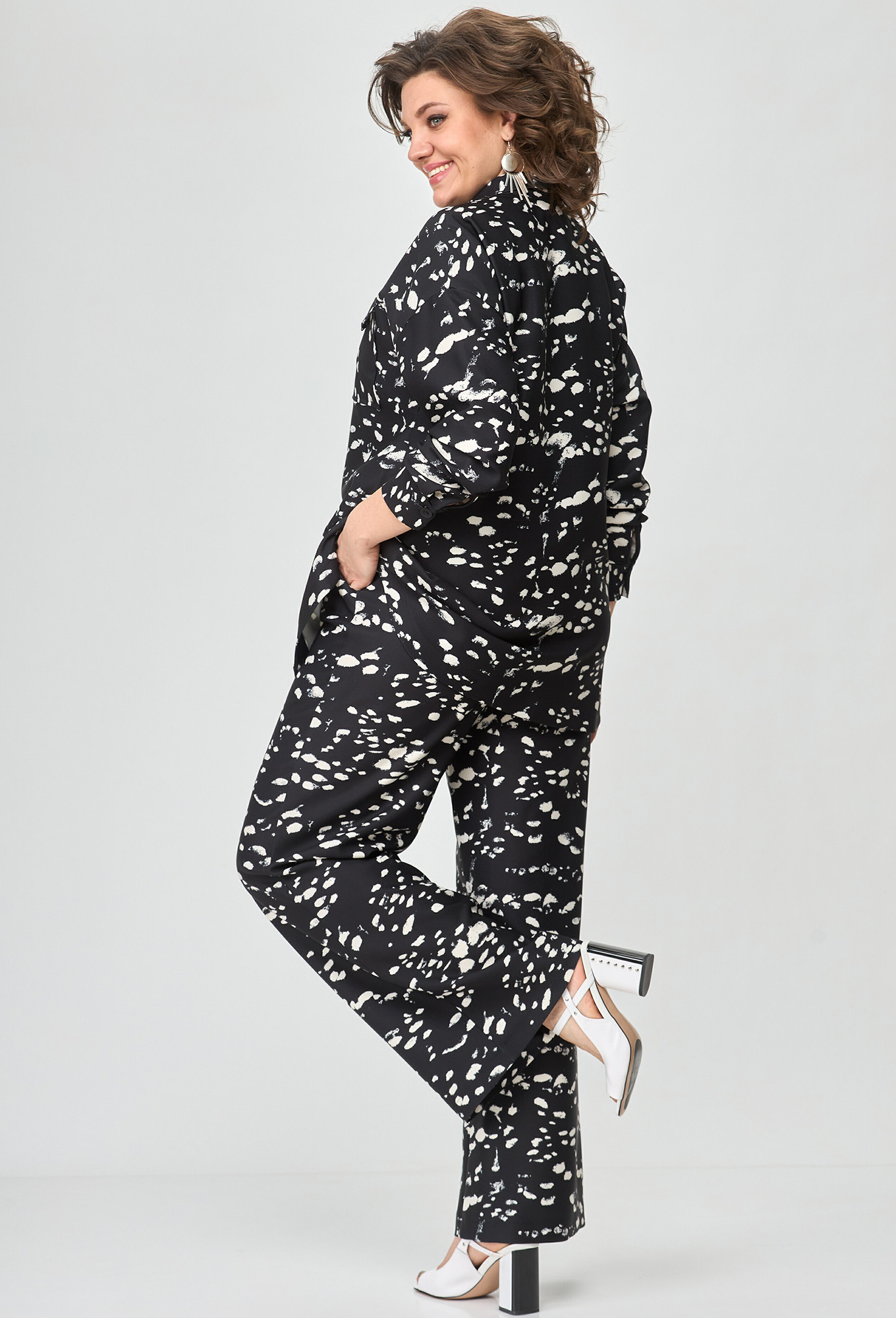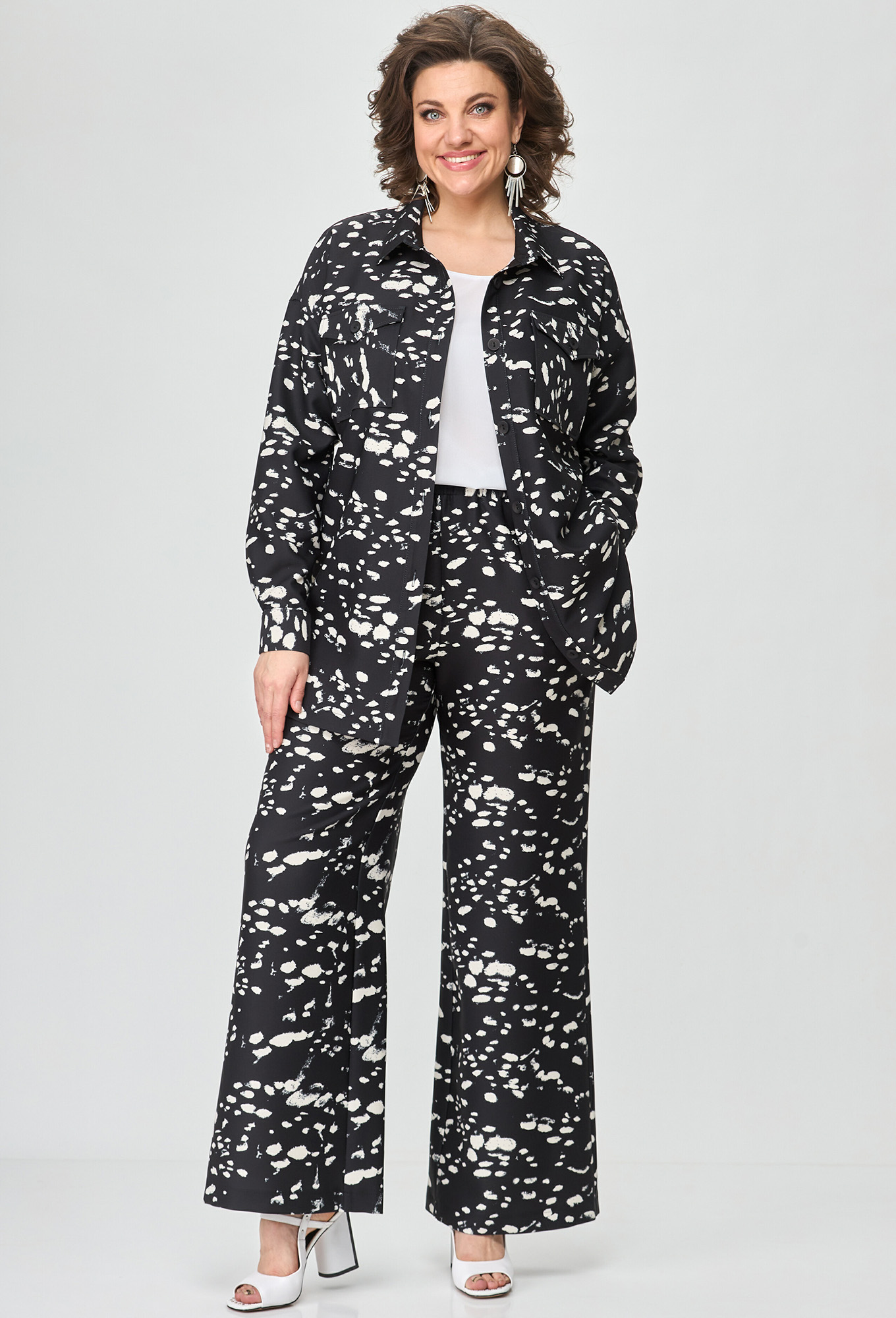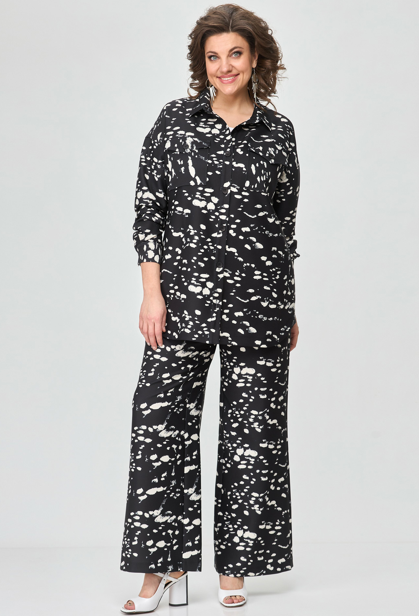 Модель: Анастасия Мак 1091 черный ..показать>Рост: 164 см (девушка на фото ростом 170см) Сезон: Весна-Лето Тип ткани: 95% ПЭ, 5% СпандексКостюм выполнен из ткани с набивным рисунком. Костюм состоит из рубашки и брюк. Рубашка прямого силуэта.