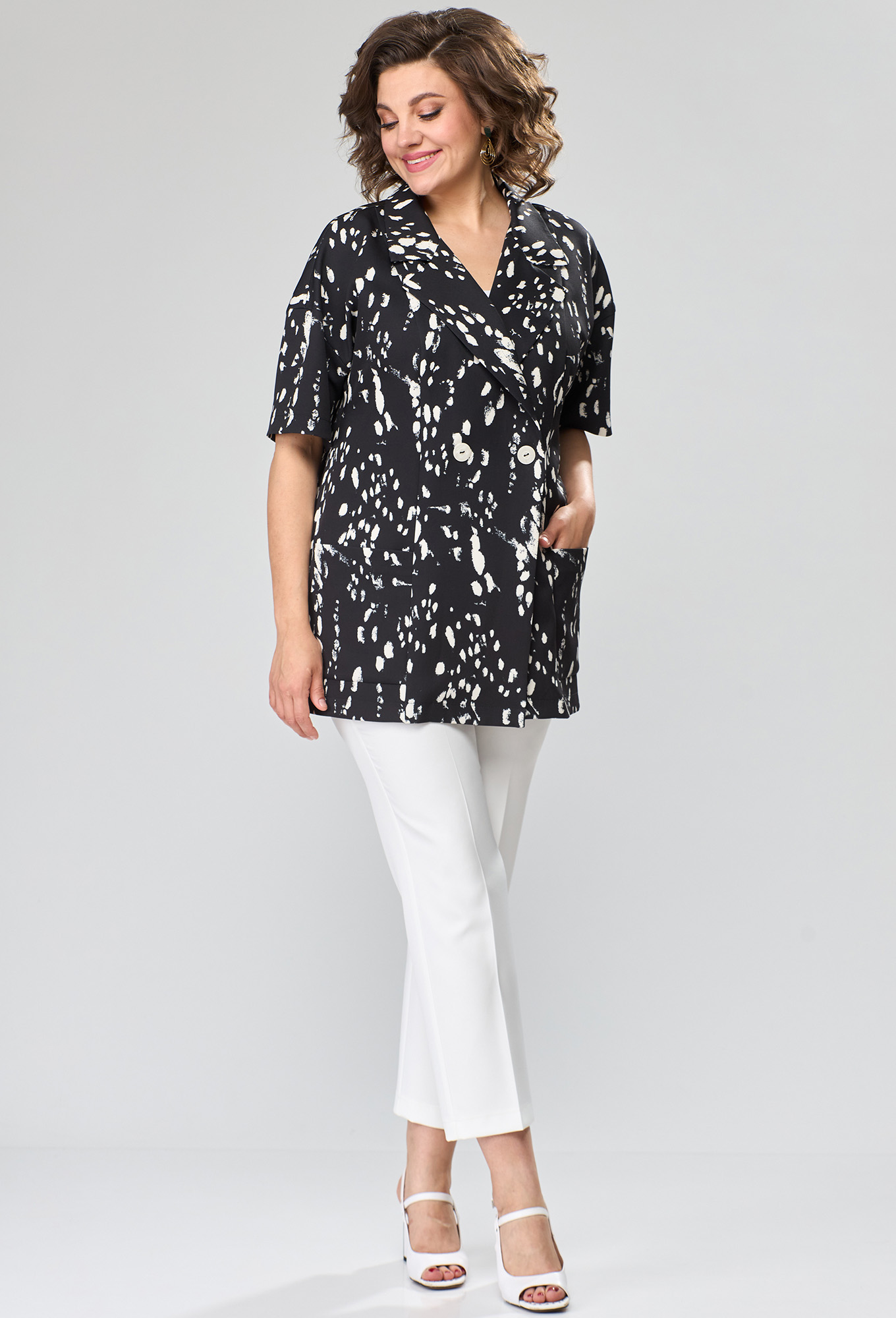 Модель: Анастасия Мак 1113 черный ..показать>Рост: 164 см (девушка на фото ростом 170см) Сезон: Весна-Лето Тип ткани: Жакет- 95 ПЭ%, 5% эластан, Брюки- 94 ПЭ, 6- спандексКостюм состоит из жакета и брюк. Жакет выполнен из ткани с набивным рисунком. Брюки из однотонной ткани.