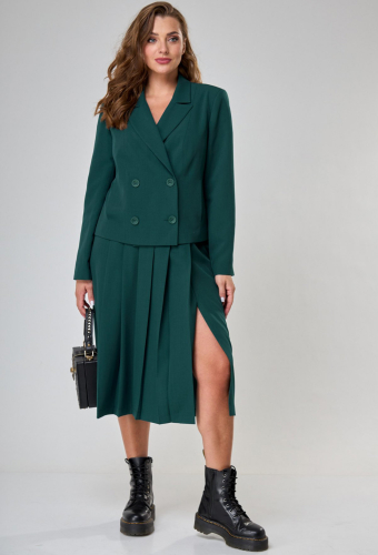 Полочка жакета с двубортной застежкой на петли и пуговицы, горловина V-образной формы, с отложными лацканами и воротником пиджачного типа. Полочка с вертикальными рельефами и прорезным карманом в шве. Спинка жакета со средним швом и вертикальными рельефами. Рукав длинный, втачной, двухшовный.