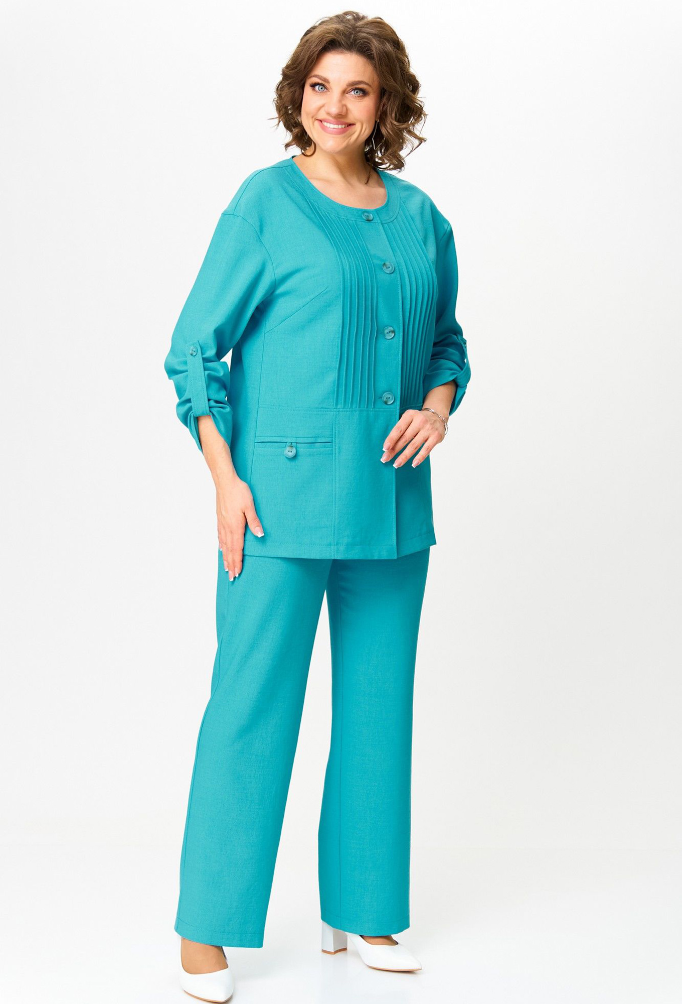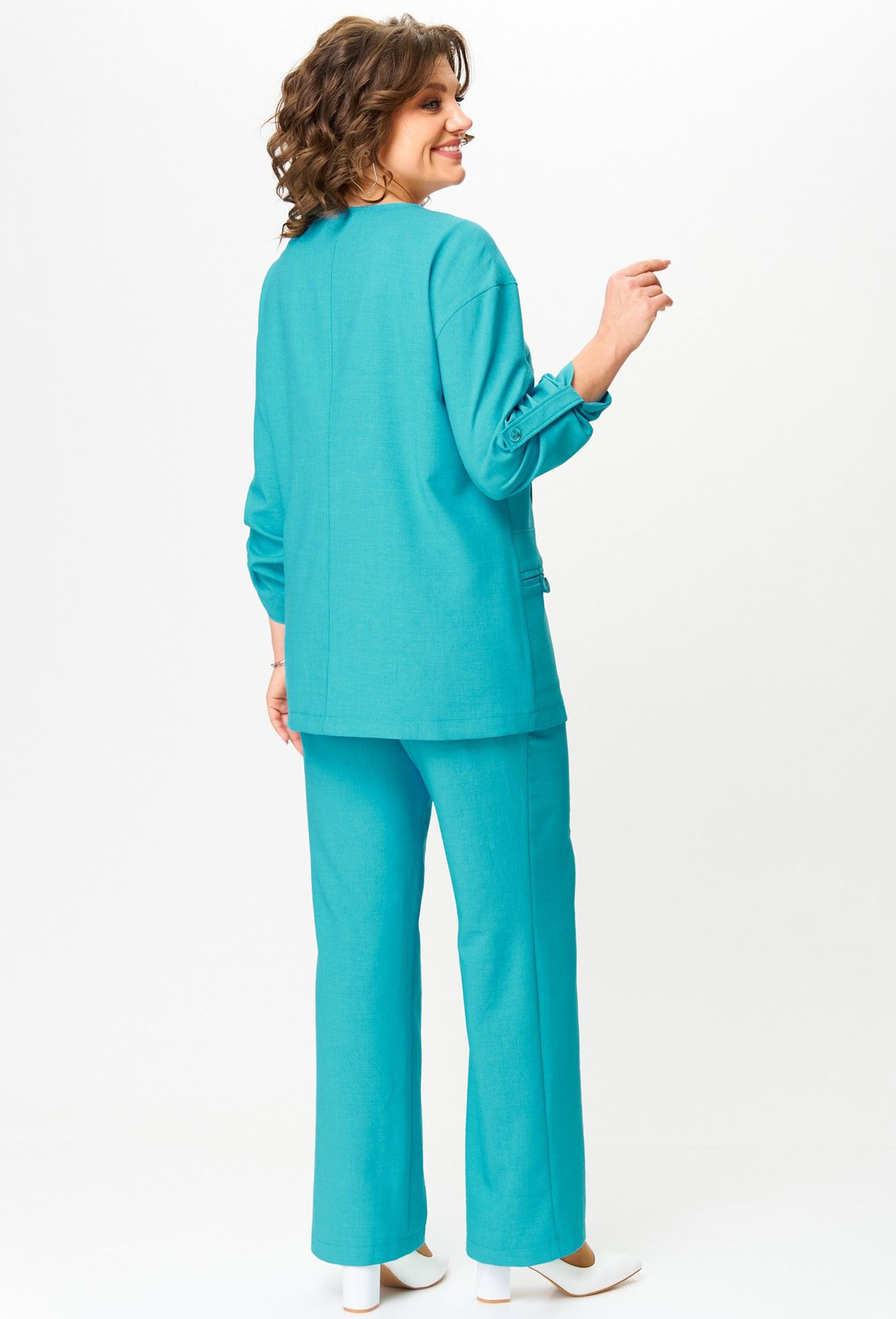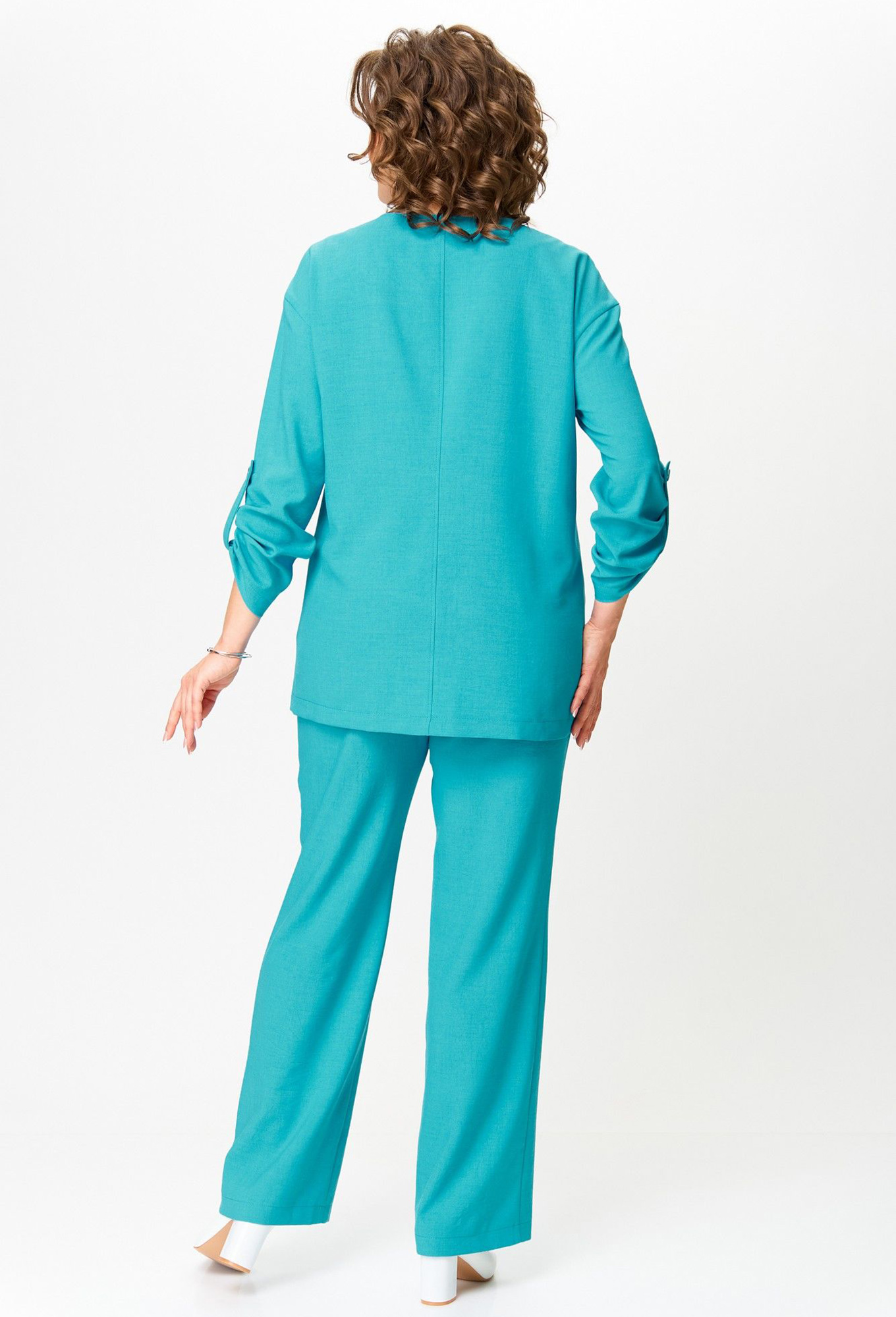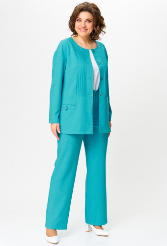 Модель: Анастасия Мак 1234 бирюза ..показать>Рост: 164 см (девушка на фото ростом 170см) Сезон: Весна-Лето Тип ткани: 100% ПолиэстерКостюм состоящий из жакета и брюк, выполнен из однотонной ткани.