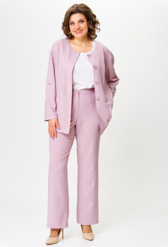 Жакет прямого силуэта с центральной застежкой на петли и пуговицы. Полочка жакета в верхней части с вертикальными защипами и нагрудной вытачкой. Нижняя часть полочки с вертикальным рельефом и карманом в рамку с застежкой на навесную петлю и пуговицу. Горловина круглой формы с притачной планкой. Спинка со средним швом. Пройма рубашечного типа. Рукав длинный, одношовный, с настроченной патой для возможности фиксировать рукав в закатанном виде.
