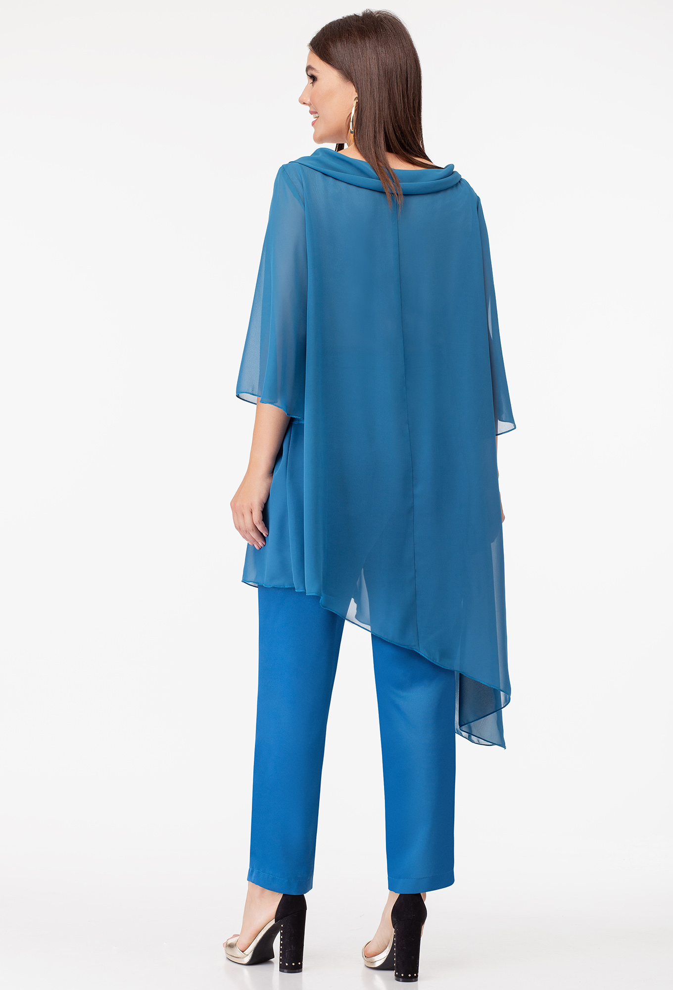 Модель: Анастасия Мак 660 голубой ..показать>Рост: 164 см (девушка на фото ростом 170см) Сезон: круглогодичный Тип ткани: Шифон - 100% Полиэстер;Блуза - 96% Полиэстер, 4% Спандекс;Брюки - 90% Полиэстер, 10% СпандексКостюм состоит из блузки и брюк. Блузка выполнена из однотонного шифона, в качестве подкладки в блузе использовано однотонное трикотажное полотно. Брюки выполнены из однотонной ткани. Блузка А-образного силуэта, с асимметричным низом. Горловина овальной формы, обработана воротником-планкой, спереди по левой части горловины декор из шифона и броши. Спинка со средним швом . Рукав одношовный, втачной, длиной 3/4 , расширенный по низу. Нижняя часть блузки - подкладка в виде майки. Полочка майки с нагрудными вытачками, спинка цельная. Брюки со стрелками. В области бедер брюки прилегающие, свободные в колене и зауженные книзу. По передним половинкам обработаны карманы и в среднем шве застёжка на молнию. По задним половинкам талиевые вытачки. Брюки на притачном поясе с эластичной тесьмой и застёжкой на петлю и пуговицу.