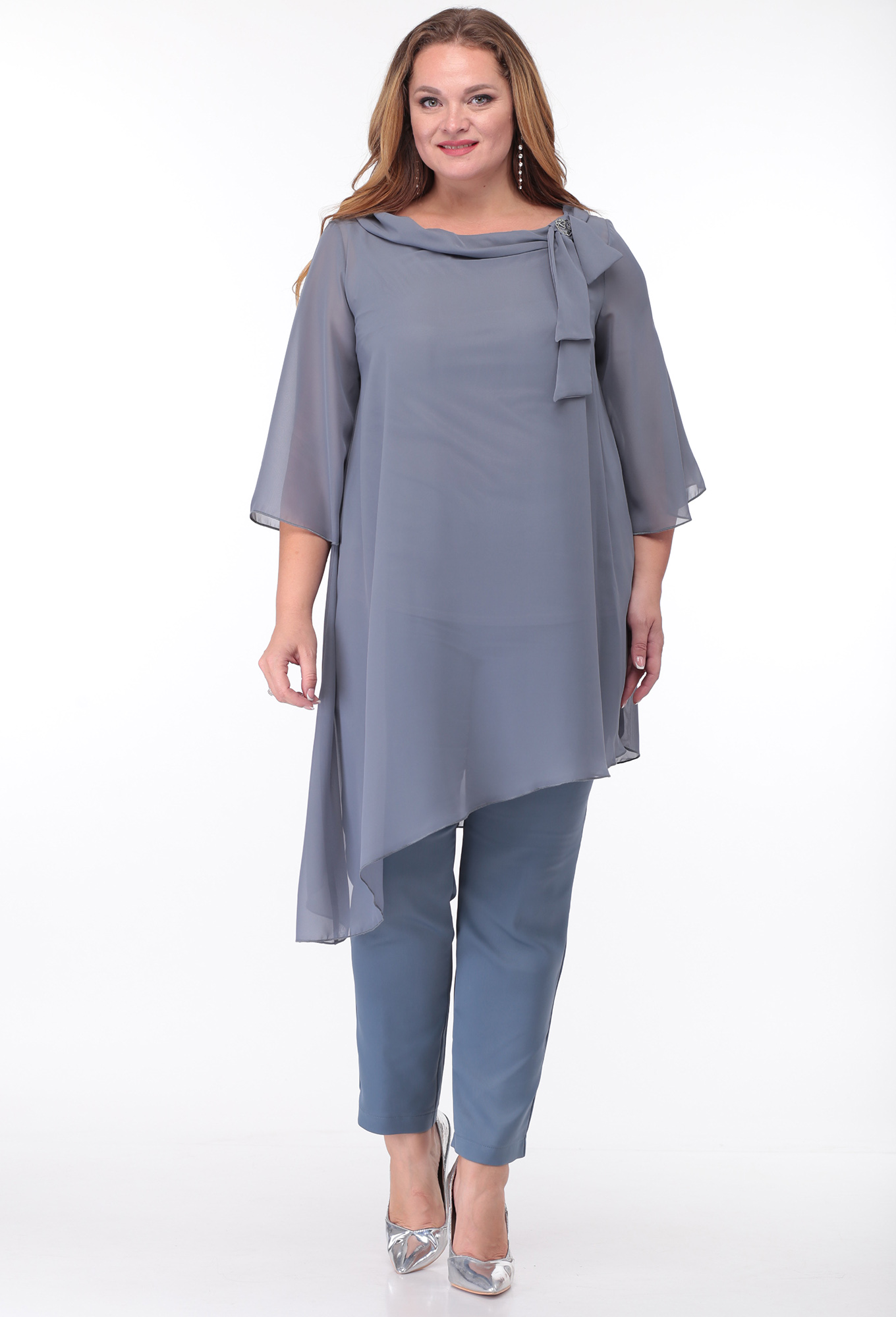 Модель: Анастасия Мак 660 серый Р..показатьост: 164 см (девушка на фото ростом 170см) Сезон: круглогодичный Тип ткани: Шифон - 100% Полиэстер;Блуза - 96% Полиэстер, 4% Спандекс;Брюки - 90% Полиэстер, 10% СпандексКостюм состоит из блузки и брюк. Блузка выполнена из однотонного шифона, в качестве подкладки в блузе использовано однотонное трикотажное полотно. Брюки выполнены из однотонной ткани. Блузка А-образного силуэта, с асимметричным низом. Горловина овальной формы, обработана воротником-планкой, спереди по левой части горловины декор из шифона и броши. Спинка со средним швом . Рукав одношовный, втачной, длиной 3/4 , расширенный по низу. Нижняя часть блузки - подкладка в виде майки. Полочка майки с нагрудными вытачками, спинка цельная. Брюки со стрелками. В области бедер брюки прилегающие, свободные в колене и зауженные книзу. По передним половинкам обработаны карманы и в среднем шве застёжка на молнию. По задним половинкам талиевые вытачки. Брюки на притачном поясе с эластичной тесьмой и застёжкой на петлю и пуговицу.ост: 164 см (девушка на фото ростом 170см)