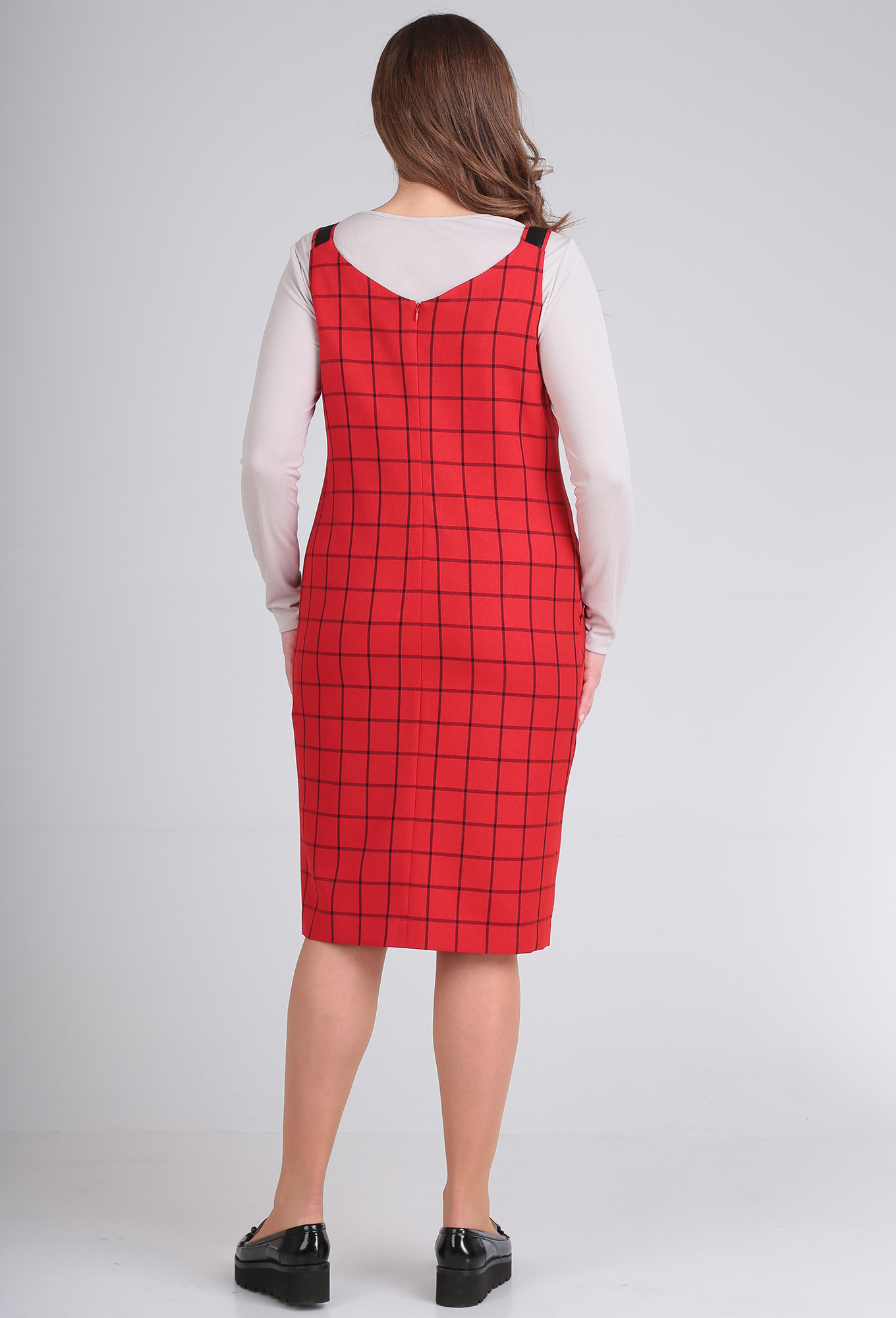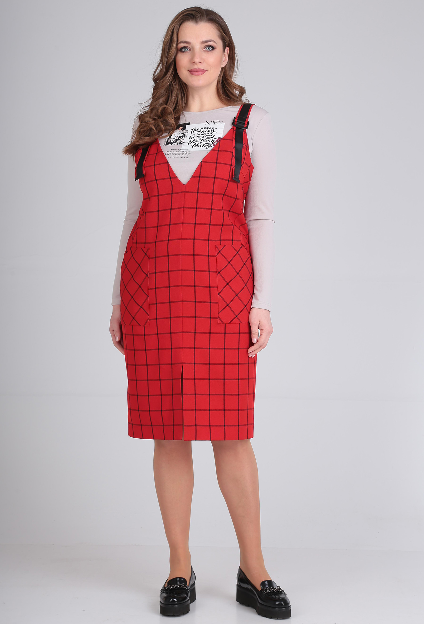 Модель: Анастасия Мак 689 красный ..показать>Рост: 164 см (девушка на фото ростом 170см) Сезон: круглогодичный Тип ткани: 90% ПЭ, 10% Вискоза; 60% Модал, 40% ПЭКостюм состоит из сарафана и джемпера. Сарафан выполнен из ткани в клетку. Джемпер выполнен из однотонного трикотажного полотна в рубчик. Сарафан прямого силуэта, длиной за колено. Полочка с центральным швом, в нижней части которого обработан разрез. Горловина V-образной формы. Полочка с нагрудными вытачками, отрезным бочком и накладными карманами. Спинка сарафана со средним швом, в верхней части которого обработана потайная молния. Сарафан на бретелях, крепящийся спереди пряжками. Джемпер прилегающего силуэта, полочка с горловиной круглой формы и термопечатью по центру, спинка цельная, рукав длинный, одношовный, втачной.