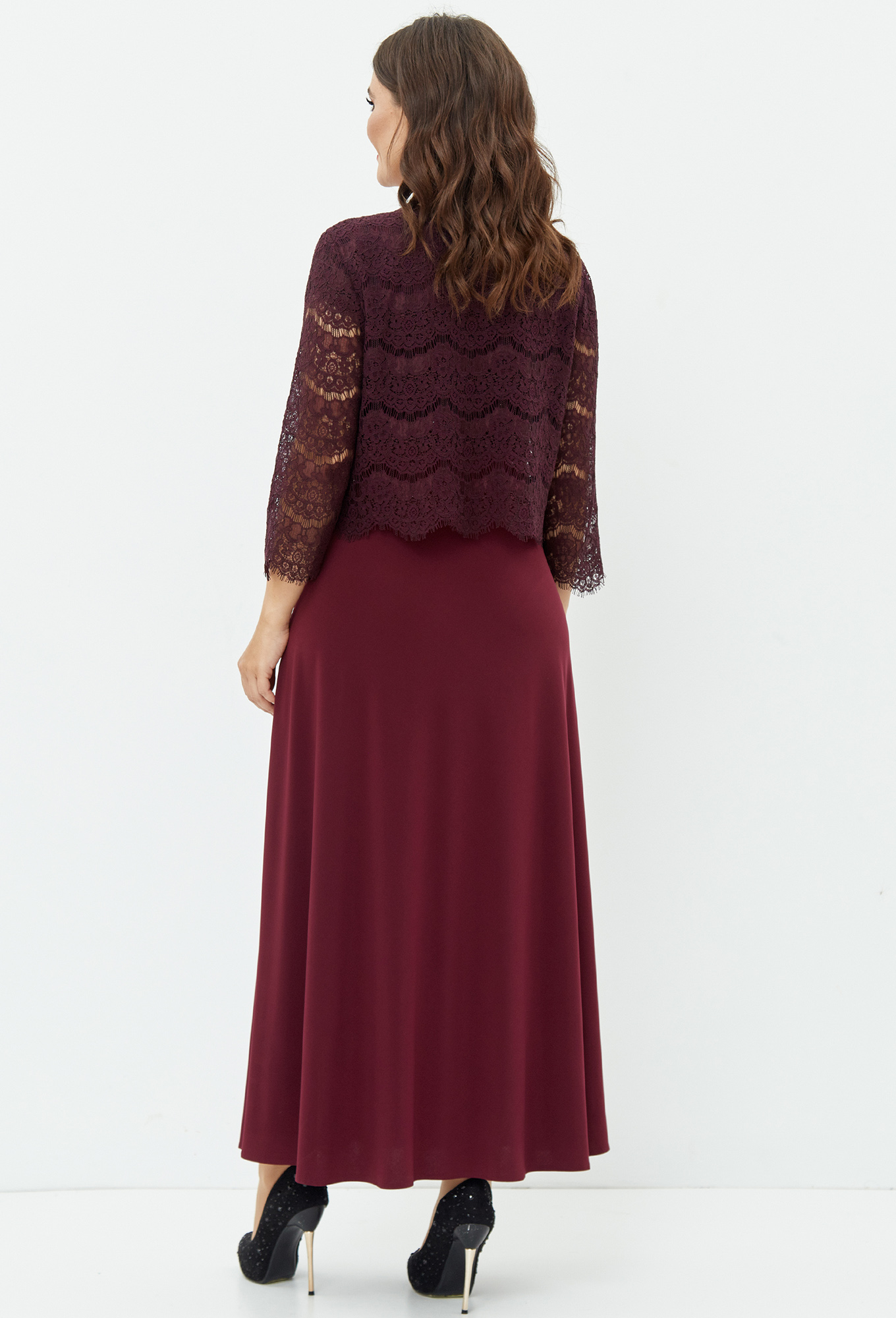 Модель: Анастасия Мак 754 бордо Р..показатьост: 164 см (девушка на фото ростом 170см) Сезон: круглогодичный Тип ткани: платье- полиэстер 60%, вискоза 35%, спандекс 5%; накидка- хлопок 50%, полиэстер 35%, вискоза 15%Платье длиной в пол. Платье отрезное чуть выше линии талии. Верхняя часть платья - лиф выполнен из трикотажного полотна "гипюр", полочка лифа с нагрудными и талиевыми вытачками. Горловина круглой формы. Спинка лифа с талиевыми вытачками. Рукав втачной, короткий, типа "крылышко", в нижней части с открытой проймой. Нижняя часть платья - юбка, скроена по косой, юбка трапециевидной формы. Застежка в левом боковом шве на потайную молнию. Полочка жакета с вертикальными рельефами, выходящими от пройм. Горловина круглой формы. Спинка жакета со средним швом и вертикальными рельефами, выходящими от пройм.