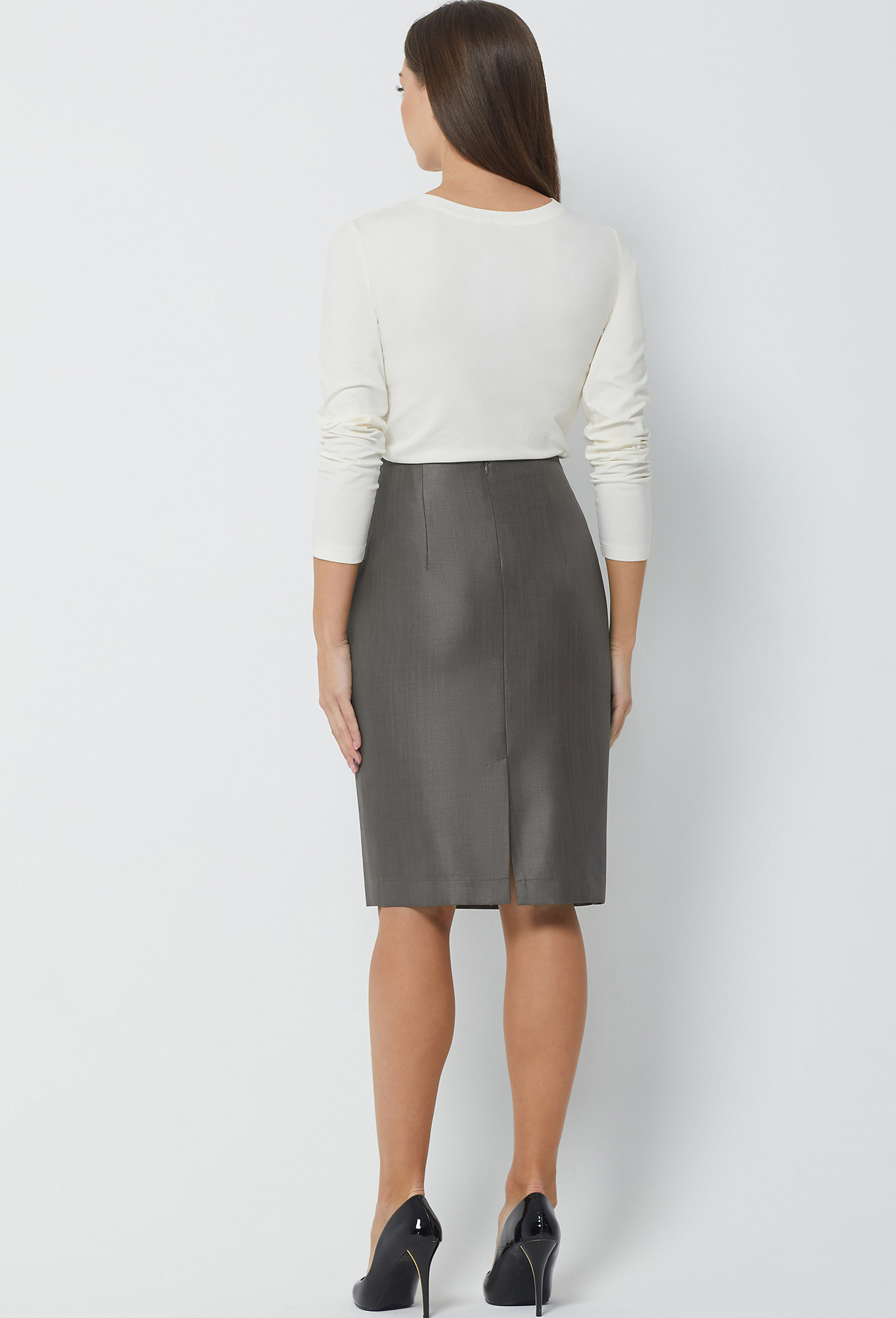 Модель: Базалини 4249 серый Рост:..показать 170 см (девушка на фото 170см) Сезон: круглогодичный Тип ткани: 65% полиэстер, 32% вискоза, 3% эластанЮбка карандаш на обтачке, в среднем шве спинки обработана потайная молния и шлица, на подкладке.