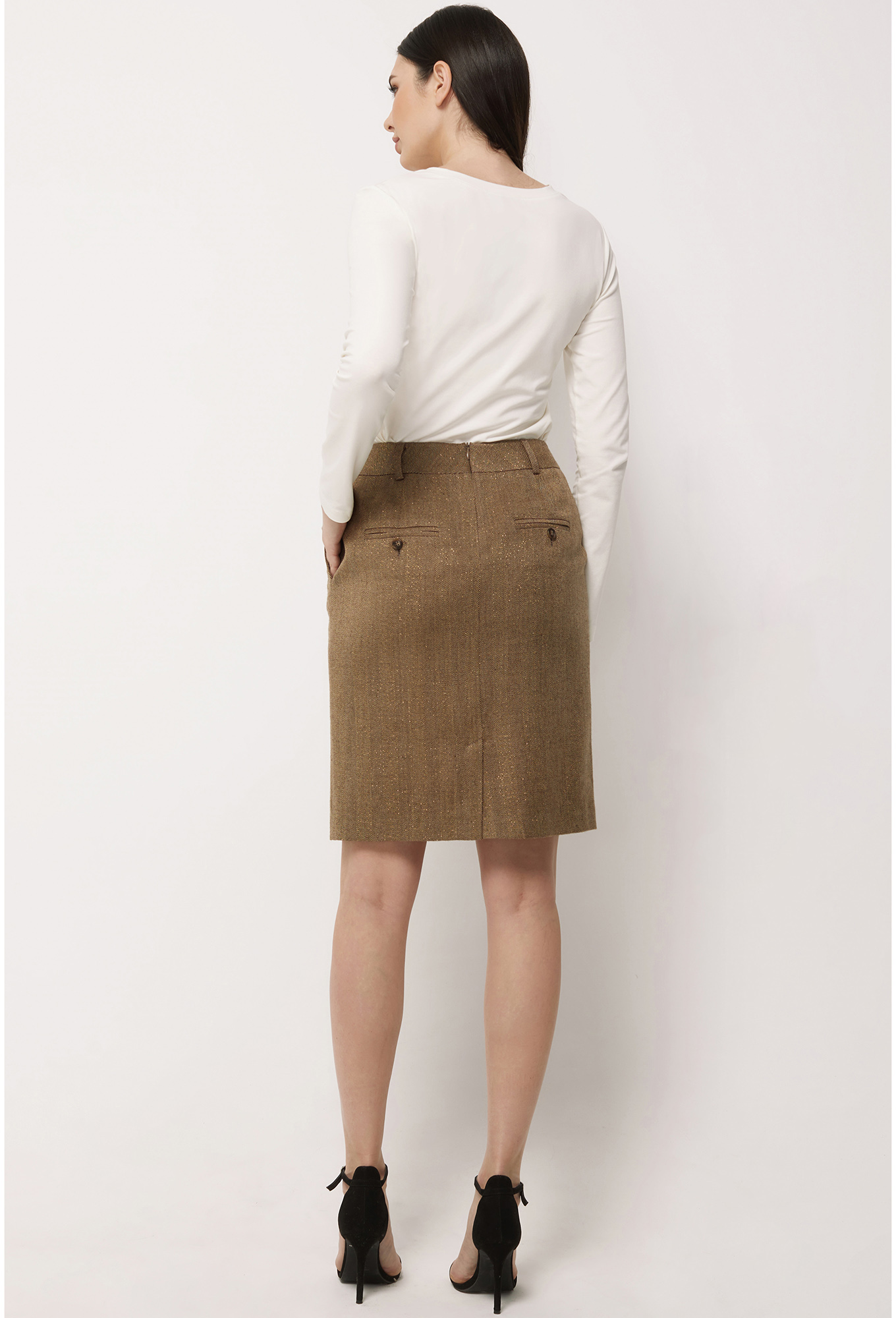 Юбка с притачным поясом со шлёвками - передняя половинка с косыми карманами - задняя половинка с двумя горизонтальными с рамками и двумя отделочными пуговицами со среднем швом, в котором обработаны потайная молния и шлица.