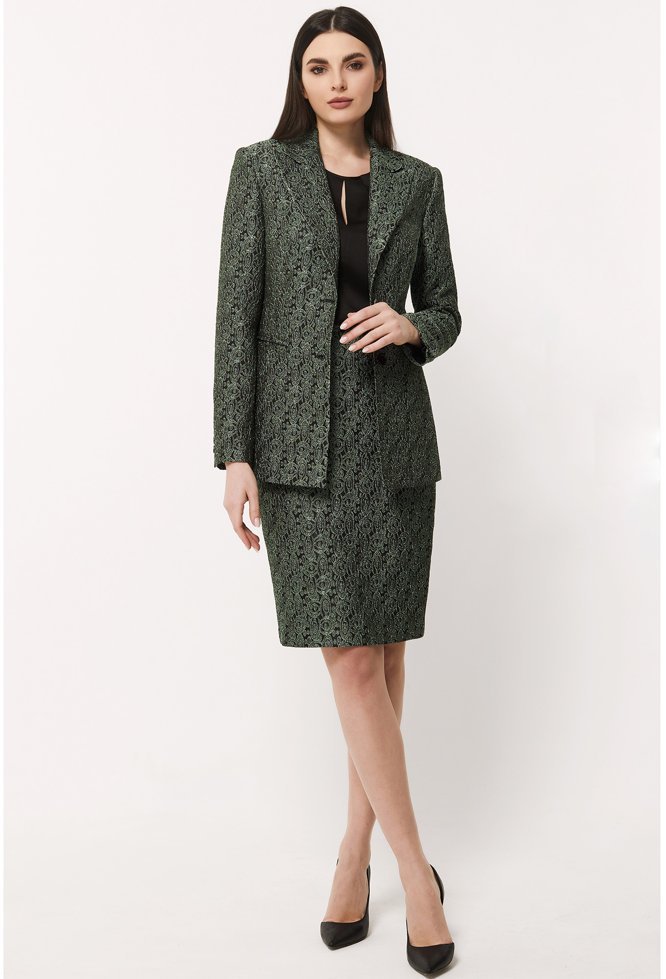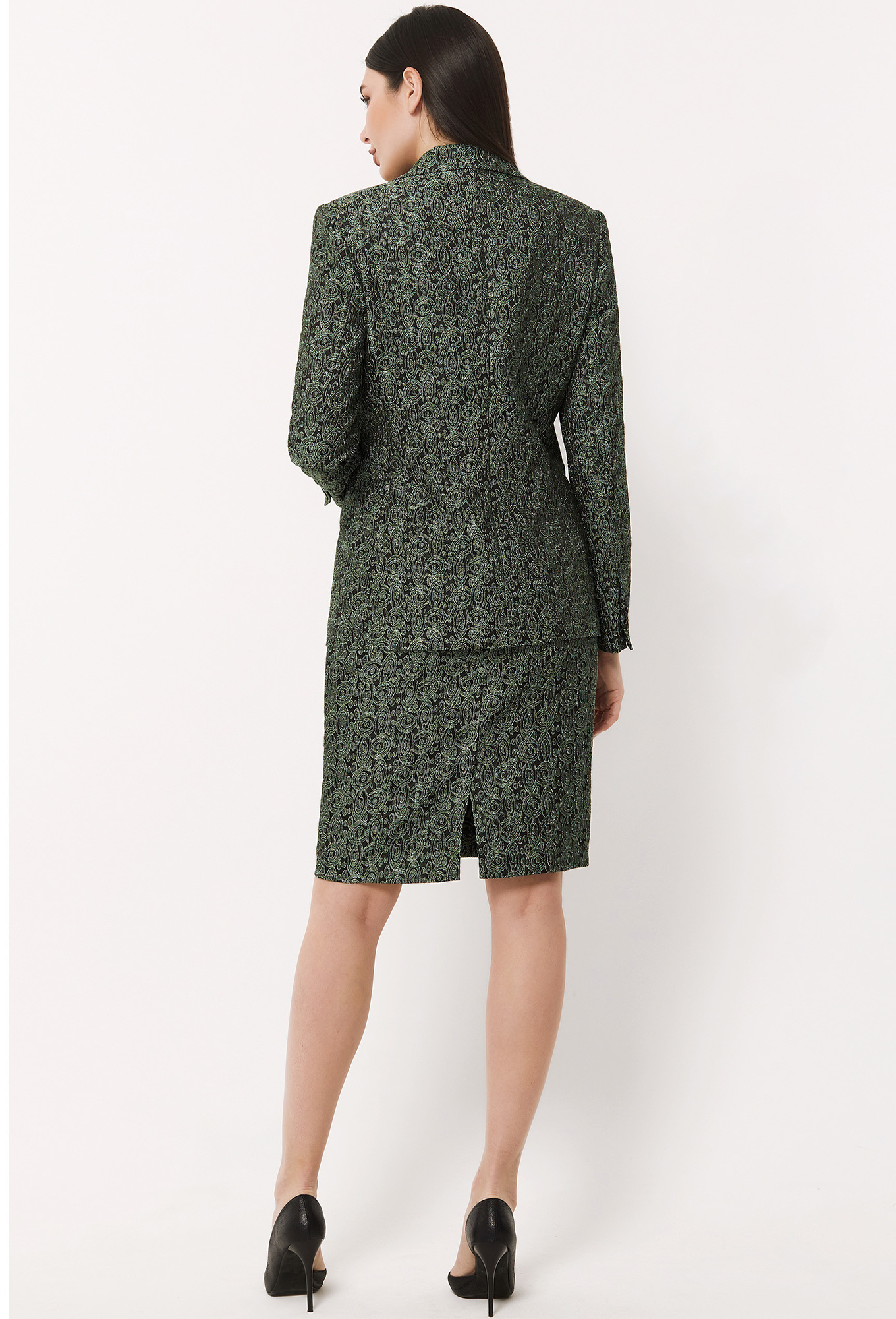 Модель: Базалини 4510/4422 зелено-черный..показатьli> Рост: 170 см (девушка на фото ростом 170см) Сезон: Круглогодичный Тип ткани: 63% полиэстер, 34% вискоза, 3% эластанСтильный однобортный жакет полуприлегающего силуэта, выполненный из жаккардовой ткани с интересным рисунком, будет эффектно смотреться как и с однотонными вещами, так и с вещами в одной гамме. Перед с глубоким V-образным вырезом горловины, с застёжкой на две петли-пуговицы и с двумя функциональными карманами с рамками. Рукава втачные двушовные с декоративными шлицами и отделочными пуговицами. На подкладке.