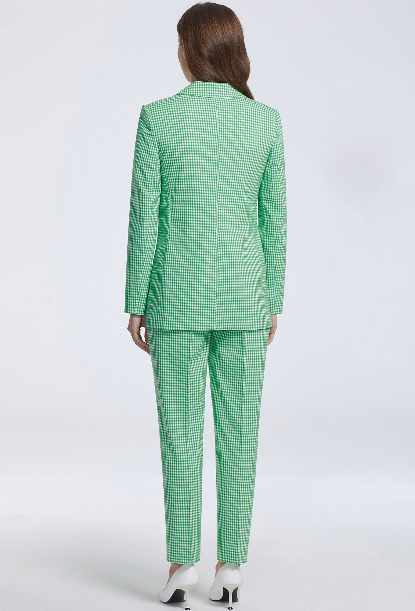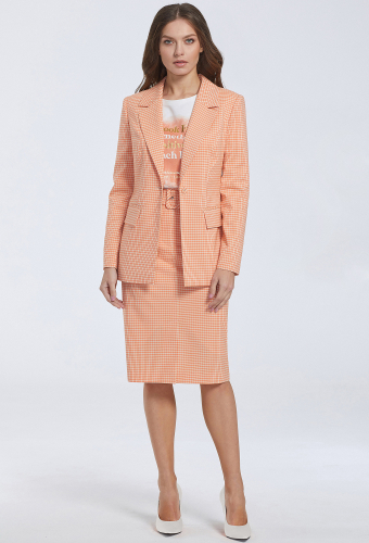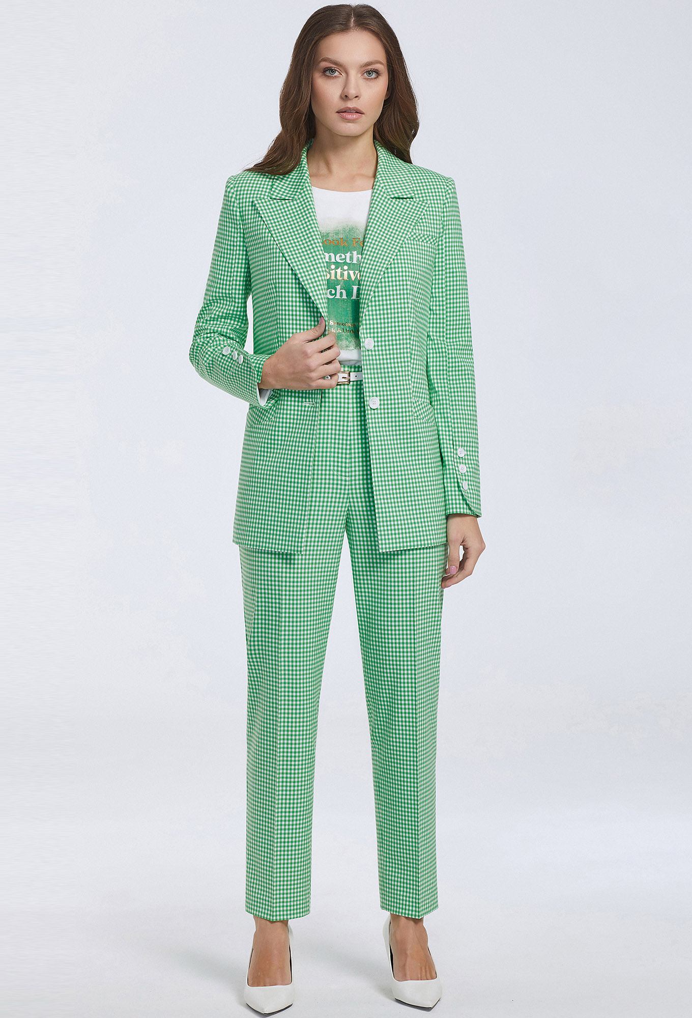 Модель: Базалини 4644/4646 зеленый клетка<..показать/li> Рост: 170 см (девушка на фото ростом 170см) Сезон: Весна-Лето Тип ткани: 64% Полиэстер, 34% Вискоза, 2% ЭластанКрасивый однобортный жакет полуприлегающего силуэта с отложным воротником и лацканами – классика делового дресс-кода. Более женственной данную модель делают интересный крой рукавов с фигурной формой низа и смещенными вперед шлицами с отделочными пуговицами. Изделие сшили из испанской, мягкой, приятной ткани с добавлением вискозы и ярким дизайном в мелкую клетку. Жакет с застежкой на петли-пуговицы с двумя функциональными карманами с листочками и одним декоративным карманом-обманкой. Рукава втачные двухшовные. На подкладке.