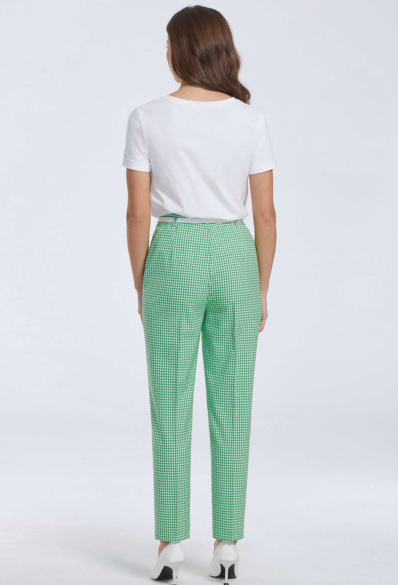 Стильные брюки со стрелками на обтачке с посадкой на талии визуально вытягивают фигуру. Модель выполнена из испанской, мягкой, приятной клетчатой ткани с добавлением вискозы