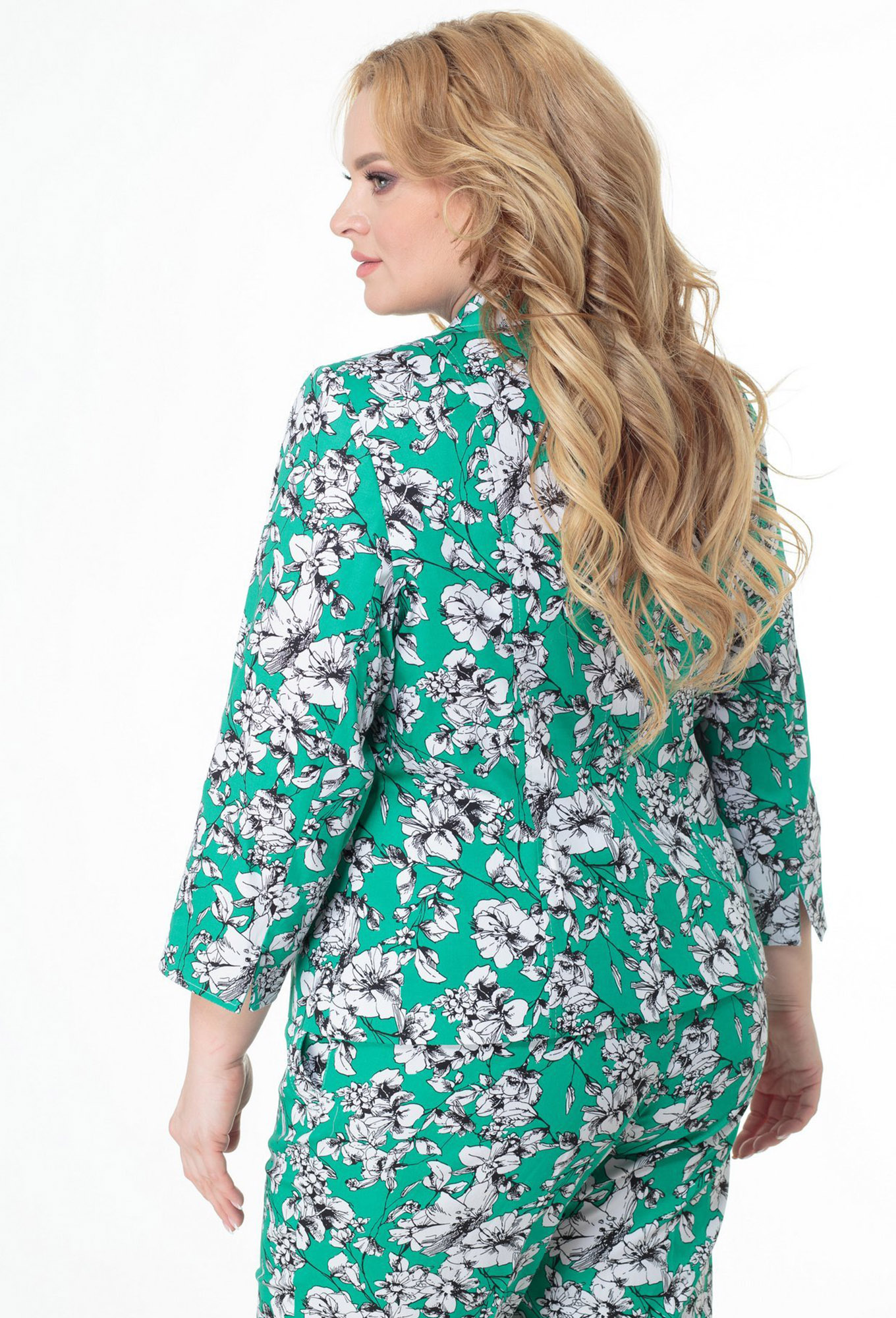 Длина жакета по спинке 59 см, длина рукава 50 см. Длина брюк от талии по боковому шву 90 см.белые цветы