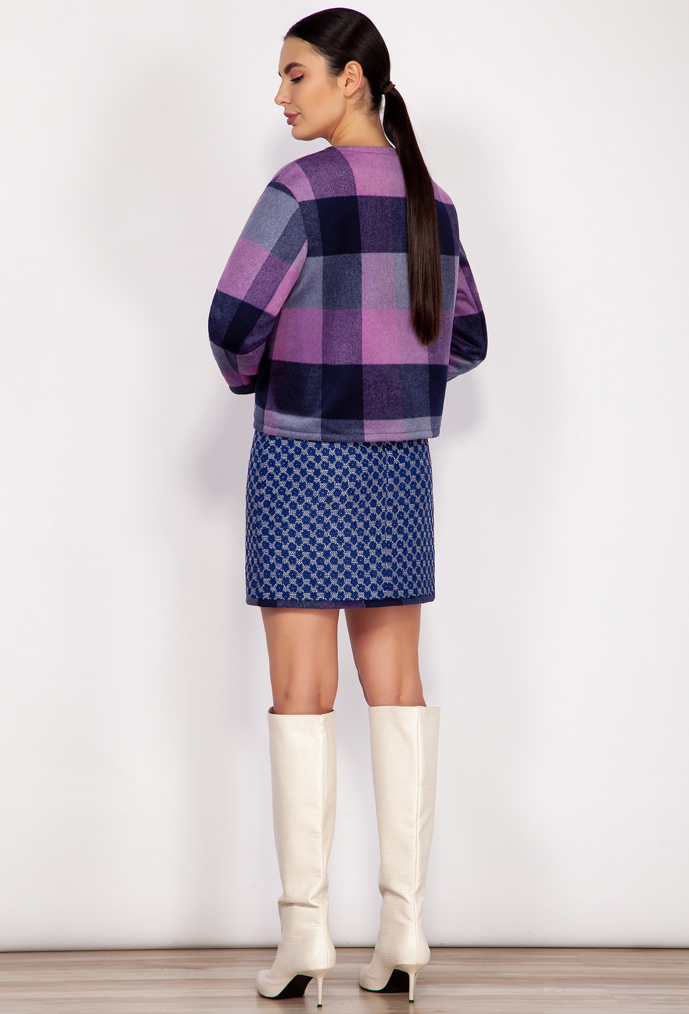Модель: Гизарт 1121 фиолетовый клетка..показать Рост: 164 см (девушка на фото ростом 170см) Сезон: Осень-Зима Тип ткани: ПЭ-75%, вискоза-25%Стильный и теплый костюм. Жакет прямого силуэта с нагрудной вытачкой из бокового шва и спущенной линией плеча. Рукав втачной двухшовный. Застежка центральная с закругленными краями борта на 5 кнопок. Перед с настрочными карманами. Вдоль горловины, борта, низа изделия и рукава, и вдоль верхнего края кармана притачана планка из отделочной ткани.