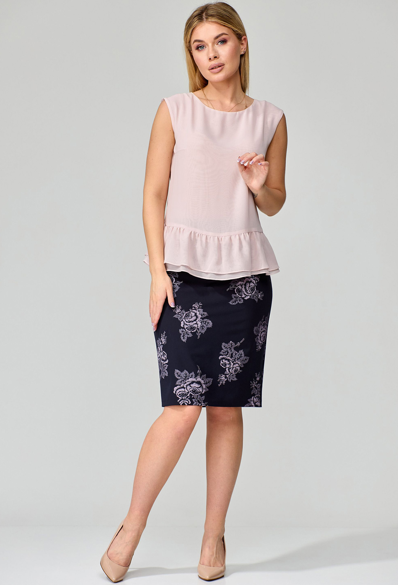 Модель: Гизарт 1178 т.синий пудра ..показать>Рост: 164 см (девушка на фото ростом 170см) Сезон: Круглогодичный Тип ткани: ПЭ 71%, вискоза 23%, спандекс 6% Блузка - ПЭ 100%Костюм состоит из жакета, блузки и юбки. Жакет прилегающего силуэта отрезной по талии с воротником пиджачного типа. Перед с нагрудной вытачкой застроченной наружу, с талиевой вытачкой по спинке и по баске. Спинка со средним швом, с талиевой вытачкой застроченной наружу, с талиевой вытачкой по баске. В баске шлица с закругленными краями. Жакет на подкладке. Блузка из двух слоев ткани с нагрудной вытачкой и с воланом на сборке по низу . Юбка зауженная книзу. По передней и задней частям талиевые вытачки. В задней части средний шов, на молнии сверху и со шлицей по низу.