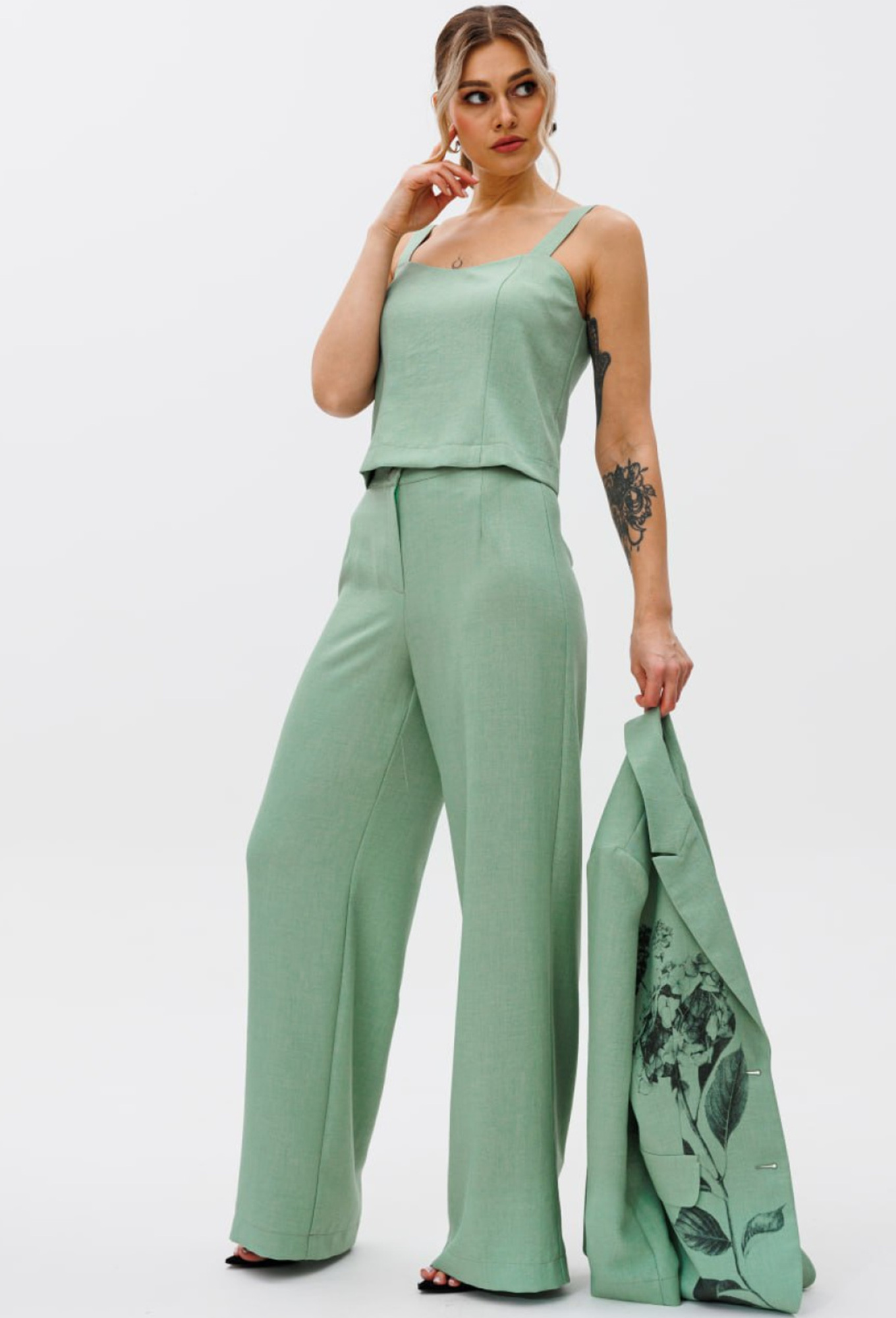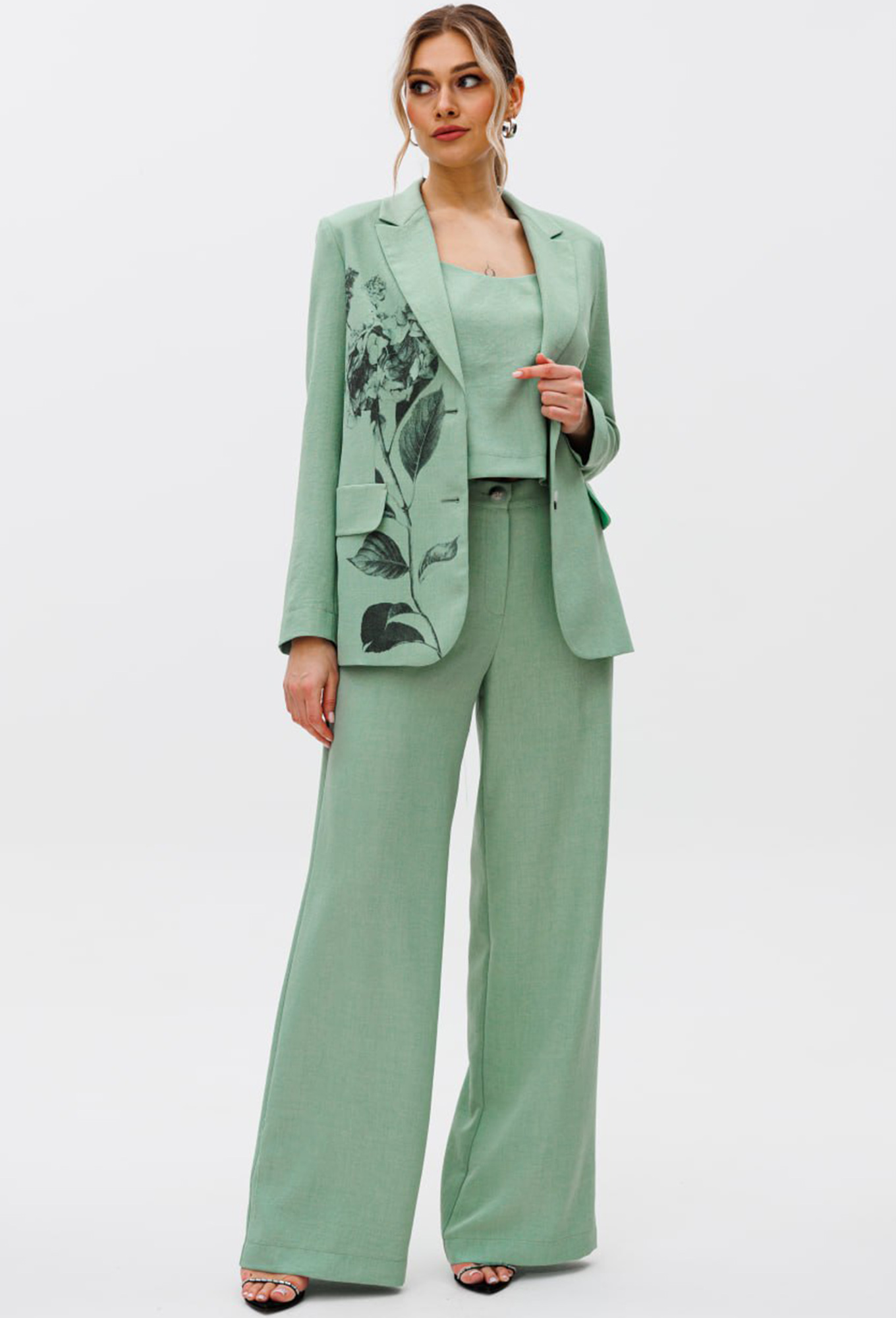 Модель: Гизарт 5204 мята Рост: 17..показать0 см (девушка на фото ростом 170см) Сезон: Весна-Лето Тип ткани: Полиэстер 62%, вискоза 32%, спандекс 6%Костюм состоит из жакета, топа и брюк. Жакет полуприлегающего силуэта с однобортной застежкой на две петли и пуговицы и воротником пиджачного типа. Борт закругленный. Перед с талиевой вытачкой и настрочными клапанами. Спинка с рельефом и средним швом. Рукав втачной двухшовный.Топ слегка приталенный на широких бретелях. Перед с рельефами, спинка со средним швом. Брюки расширенные книзу с притачным поясом. По передней и задней частям брюк вытачки. По правому переду жакета выполнена декоративная печать. Фурнитура может быть изменена с сохранением художественного образа.