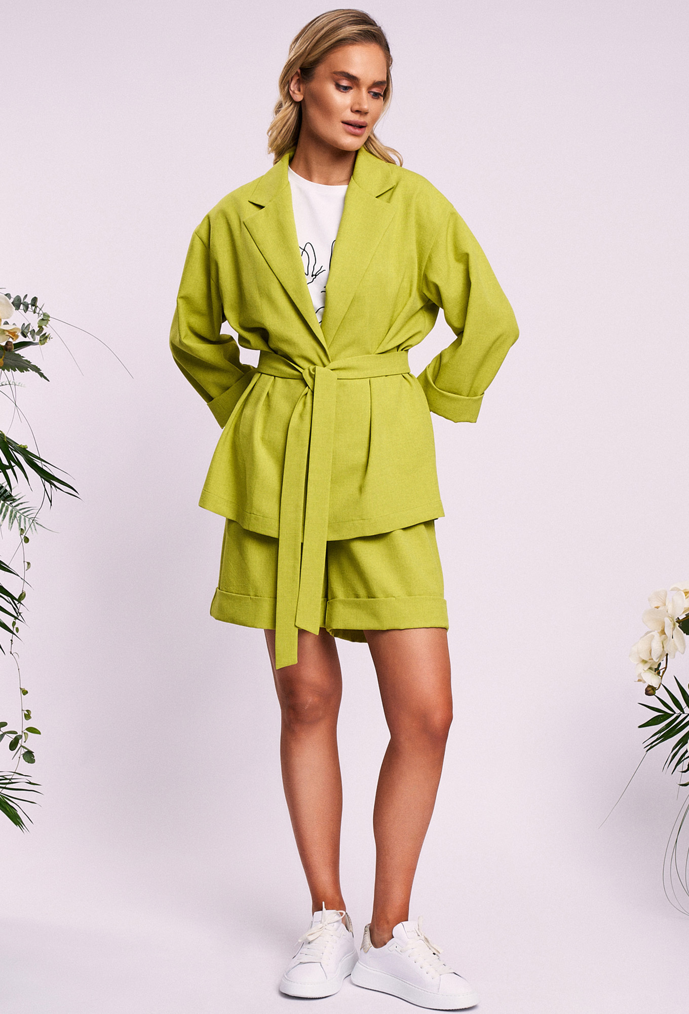 Жакет со съемным поясом, который завязывается на талии, длина до середины бёдра.Шорты женские, прямого силуэта, умеренного объема.