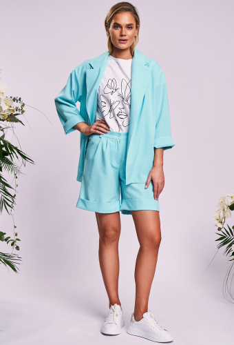 Жакет со съемным поясом, который завязывается на талии, длина до середины бёдра.Шорты женские, прямого силуэта, умеренного объема.