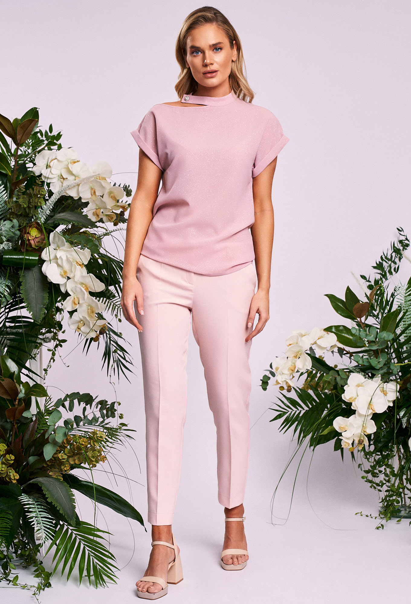 Модель: Кавари 8007 пудра Рост: 1..показать70 см (девушка на фото ростом 170см) Сезон: Круглогодичный Тип ткани: Блуза - полиэстер 100%Брюки - полиэстер 65%; вискоза 32%; эластан 3%Женский комплект 2-х предметный состоит из блузы и брюк. Нарядная женская блуза свободного силуэта длиной до середины бедра. Воротник стойка с боковой застежкой на петлю и пуговицу. Рукав цельнокроеный с отложными манжетами. Верх блузы асимметричной формы - одно плечо открыто. Брюки базовые со стрелками. Изделие имеет комфортную среднюю посадку. Брюки на притачном поясе со шлёвками. Спереди боковые функциональные карманы, сзади имитация прорезных карманов с листочкой._x000D_