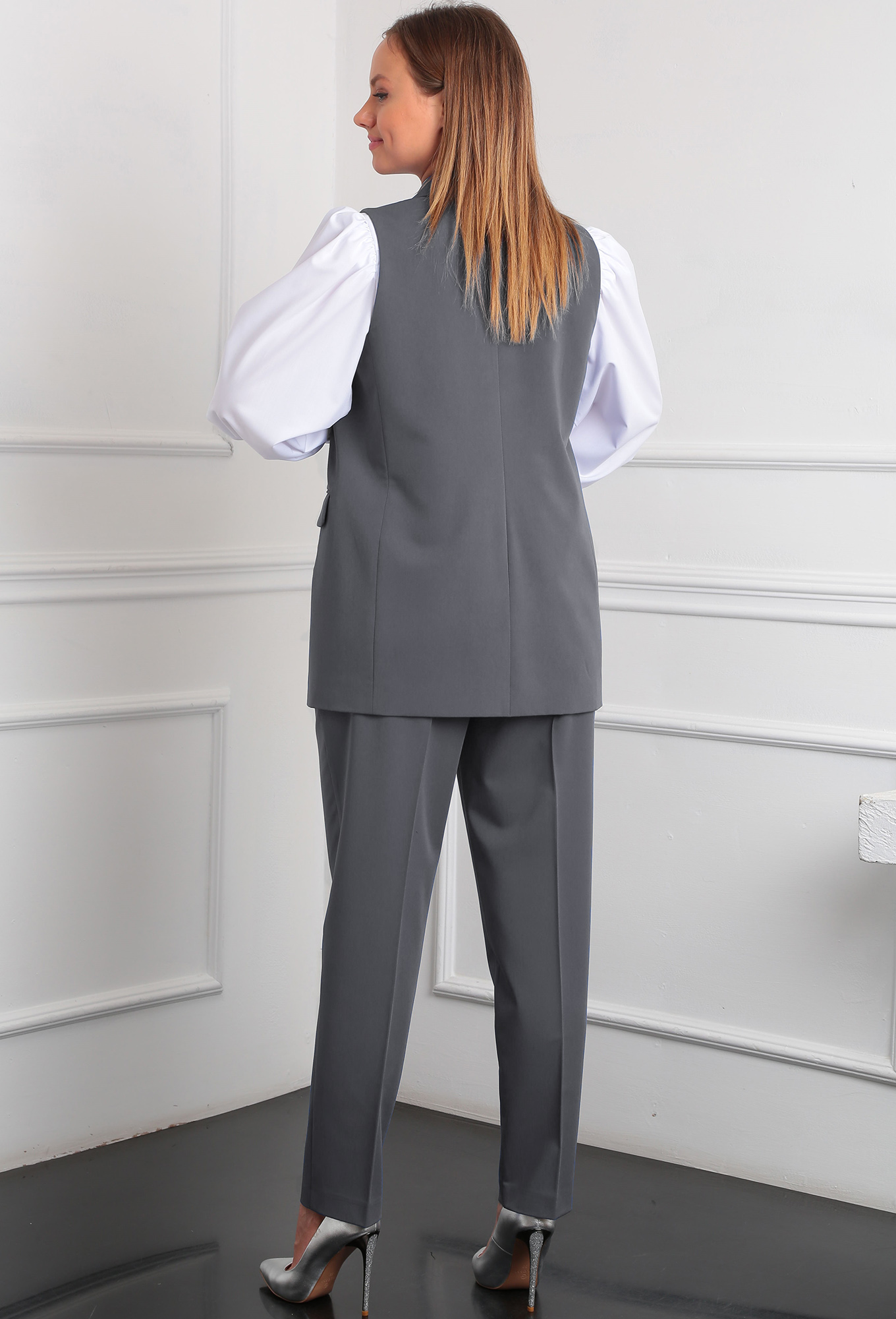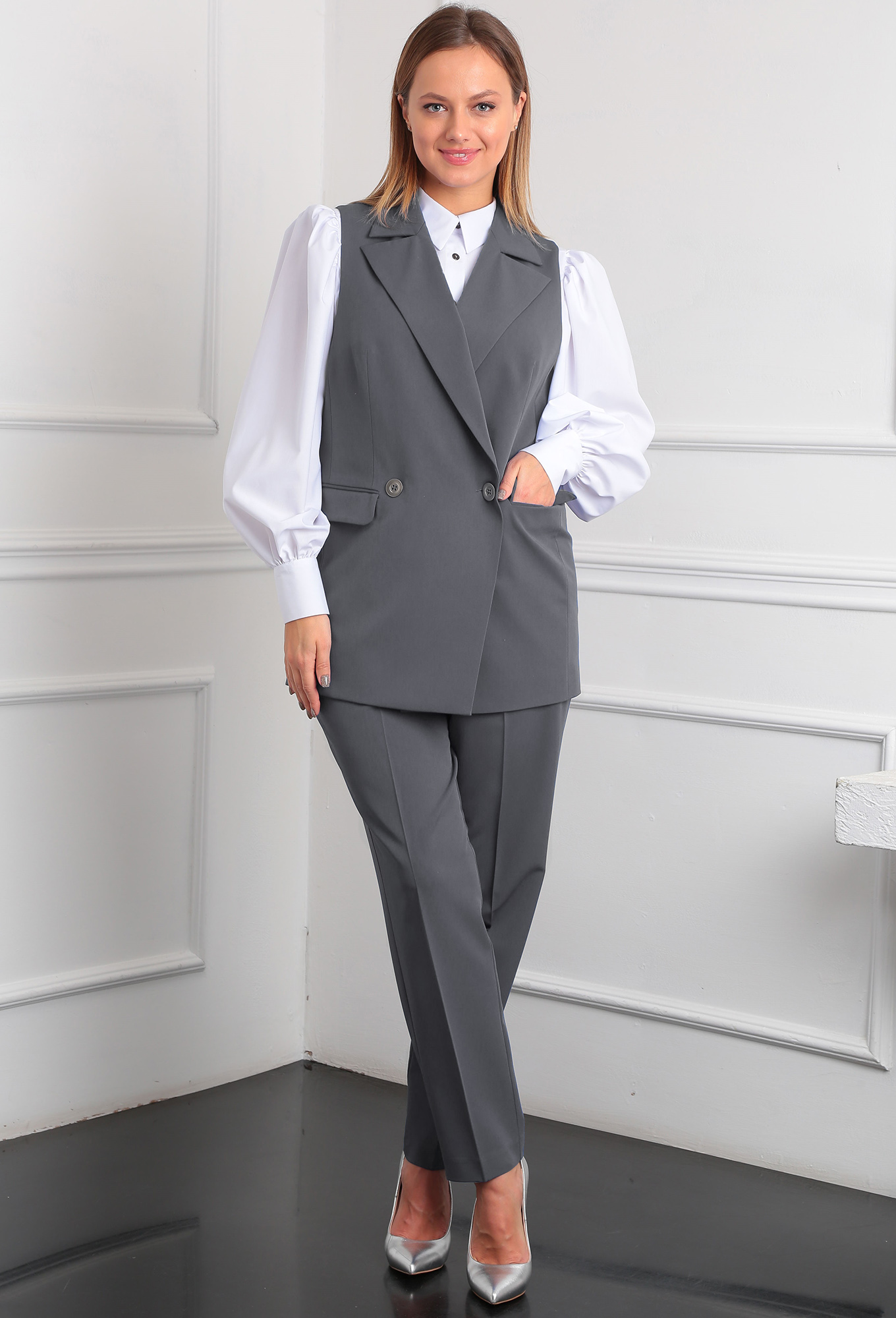 Модель: Леди Лайн 538 т.серый Рос..показатьт: 164 см (рост модели на фото 172см) Сезон: Круглогодичный Тип ткани: Хлопок 48 %, Полиэфир 49 %, Эластан 3 %Костюм 2х предметный, состоит из жилета и брюк. Силуэт прямой Жилет двубортный с застёжкой на две петли и пуговицы. Воротник и лацканы отложные. По полочкам два функциональных кармана и клапаны. По спинке средний шов и рельефы переходящие на полочки. Жилет на подкладке. Брюки слегка расширены вверху за счёт глубокой складки по переду и заужены к низу. В боковых швах карманы, по задней половине брюк расположены листочки. По переду брюки застёжкой на молнию и по обтачке на 2 пуговицы. По обтачке пришиты шлёвки для пояса. Длина жилета по центру спинки-73см, ширина на уровне глубины проймы 46р-100см,48р-104см,50р-108см Брюки длина по боковому шву-107см с обтачкой. Без обтачки и только по шву 100см