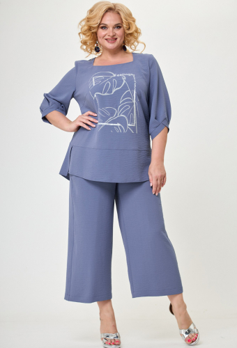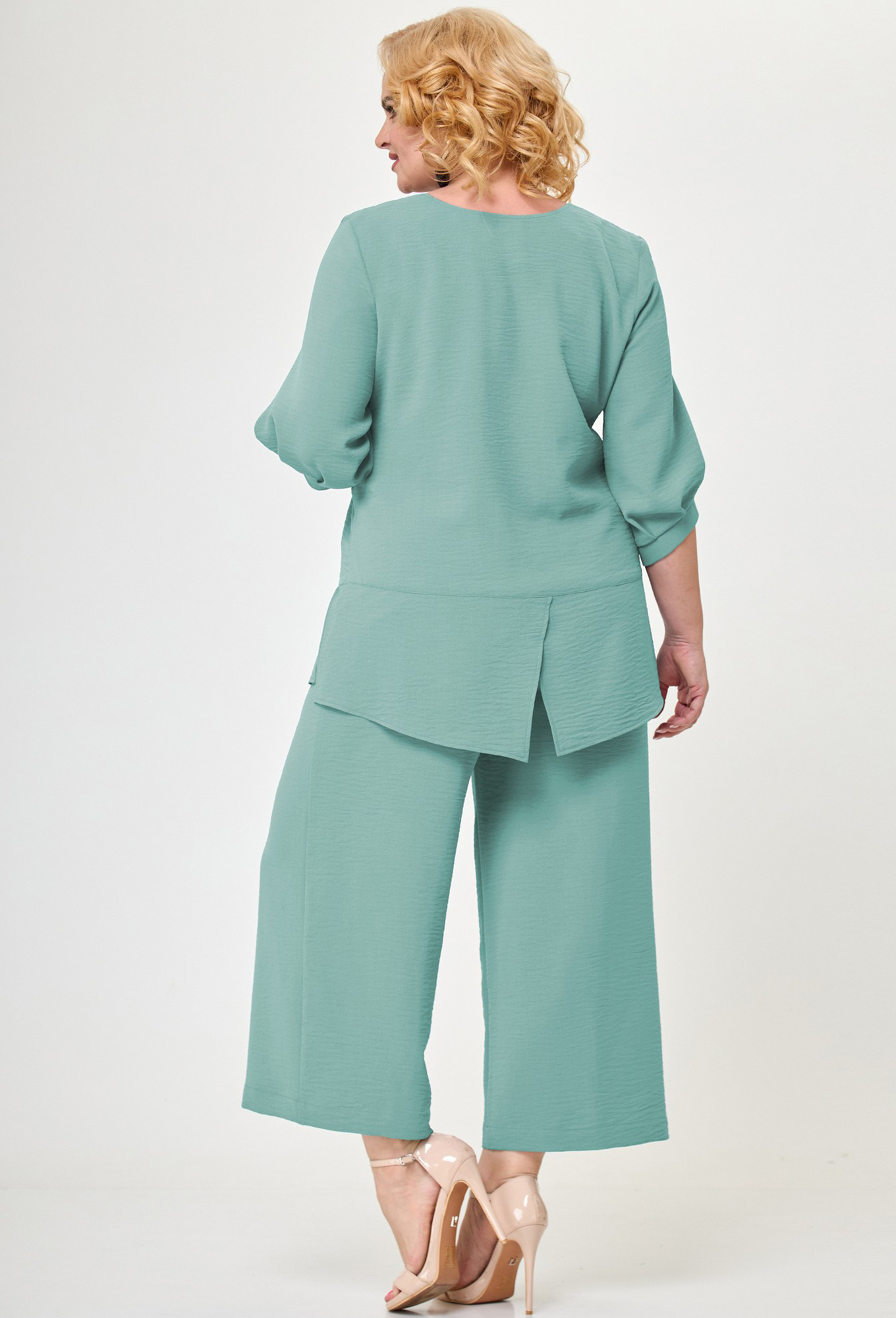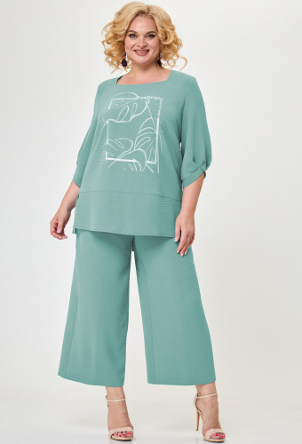 Модель: ЛТС 2221 мята Рост: 164 с..показатьм (рост модели на фото 170см) Сезон: Весна-Лето Тип ткани: Вискоза 65%, полиэстер 35%, эластан 5%Стильный и практичный комплект, состоит из блузки и кюлот выполненных из комфортной к телу тонкой ткани с эффектом крэша. Блузка прямого силуэта с трапецевидным вырезом горловины, полочка декорирована дизайнерским принтом. По низу блузки притачная баска с перехлестами по бокам и на спинке. Рукав втачной, низ рукава на фигурной притачной манжете. Кюлоты с притачным поясом, присборенном на резинку по спинке и бокам, по переду имитация застежки в виде отделочной строчки, в боковых швах функциональные карманы.