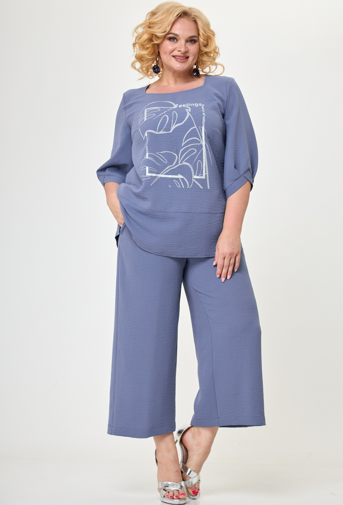Модель: ЛТС 2221 синий Рост: 164 ..показатьсм (рост модели на фото 170см) Сезон: Весна-Лето Тип ткани: Вискоза 65%, полиэстер 35%, эластан 5%Стильный и практичный комплект, состоит из блузки и кюлот выполненных из комфортной к телу тонкой ткани с эффектом крэша. Блузка прямого силуэта с трапецевидным вырезом горловины, полочка декорирована дизайнерским принтом. По низу блузки притачная баска с перехлестами по бокам и на спинке. Рукав втачной, низ рукава на фигурной притачной манжете. Кюлоты с притачным поясом, присборенном на резинку по спинке и бокам, по переду имитация застежки в виде отделочной строчки, в боковых швах функциональные карманы.