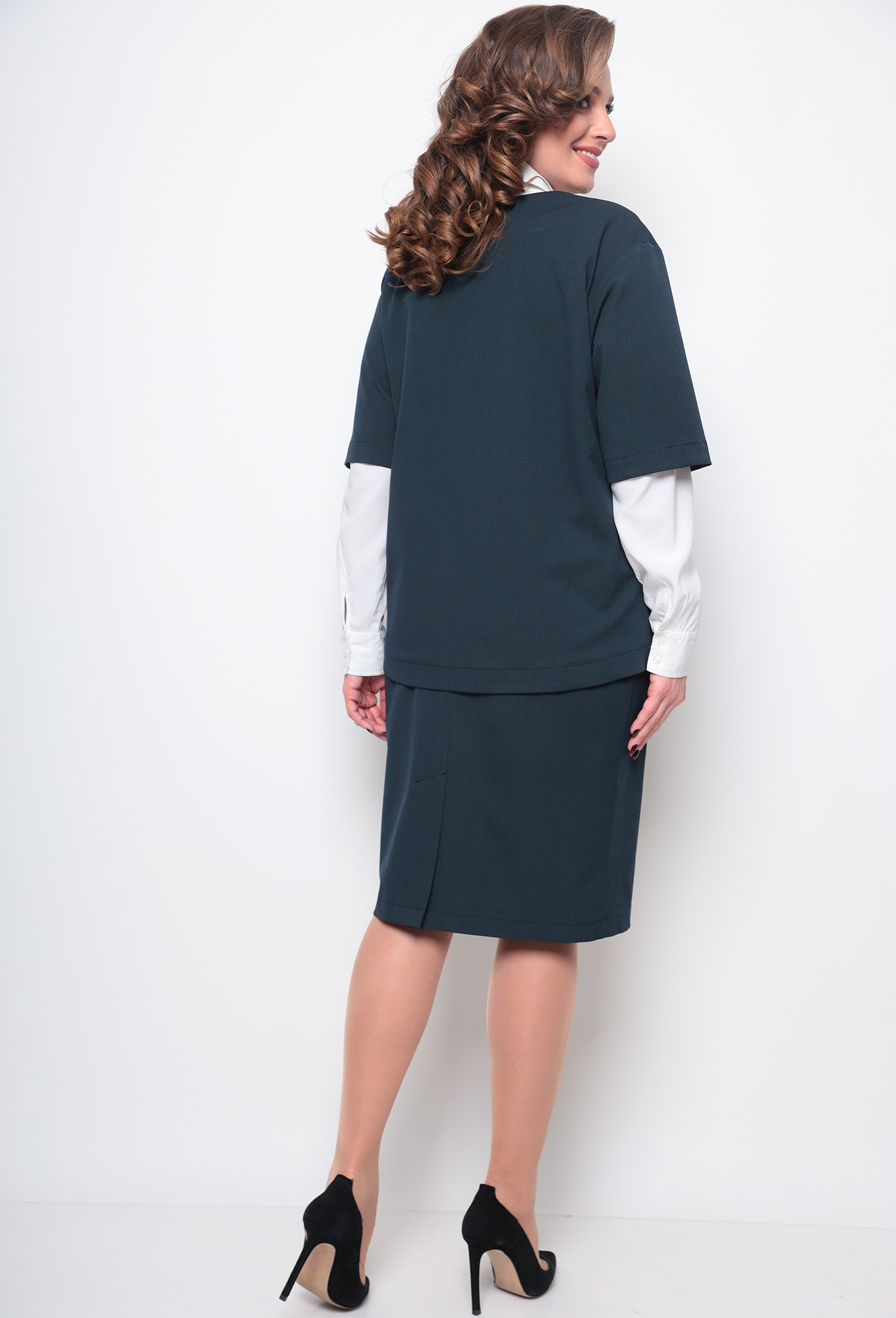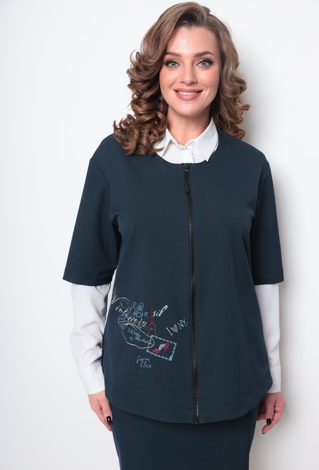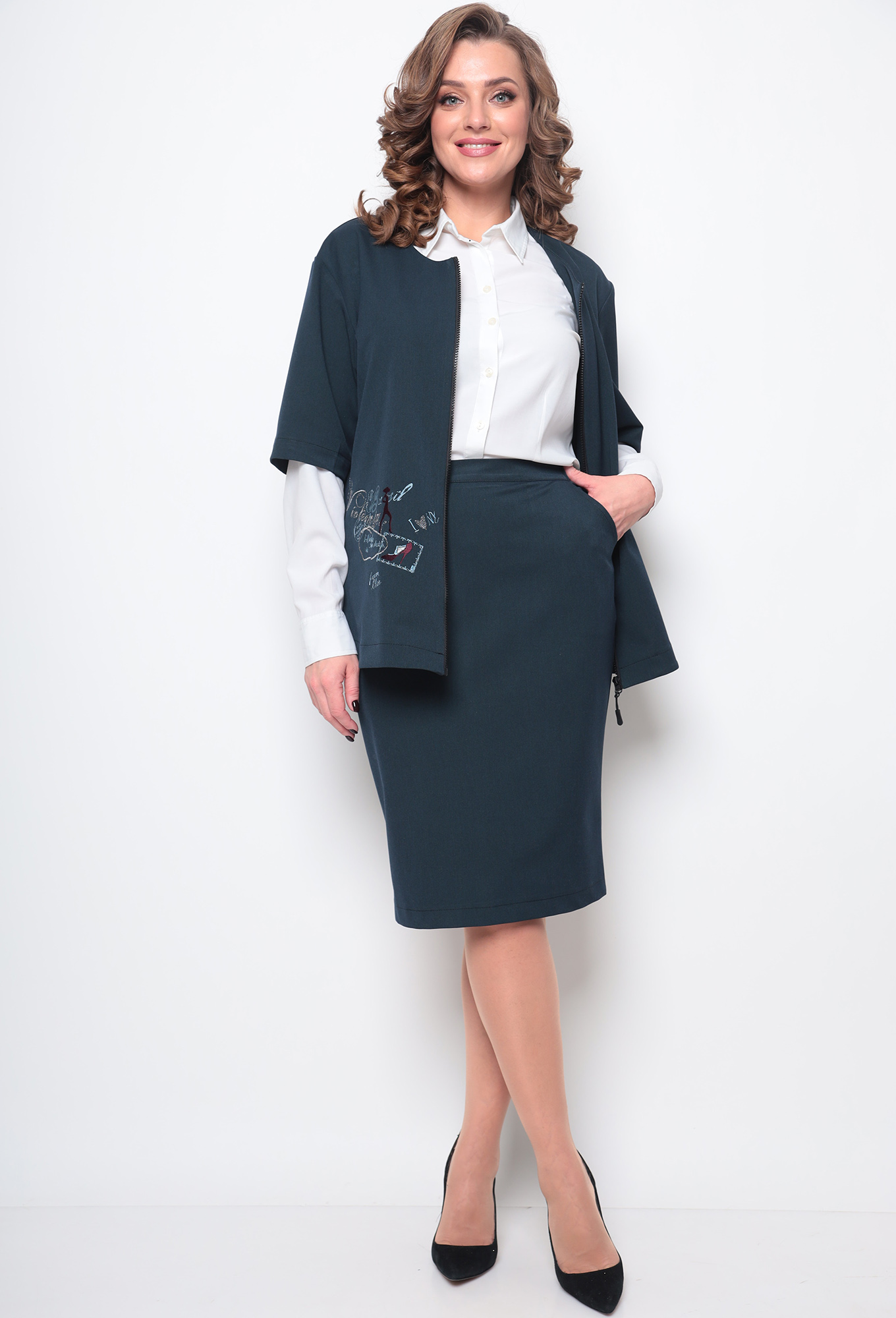 Модель: Мишель Шик 1268 сине-зеленый ..показатьРост: 164 см (девушка на фото ростом 170см) Сезон: осень-зима Тип ткани: полиэстер 67%, вискоза 29%, спандекс 4%Женственный комплект из трикотажного полотна дарит образу мягкость и элегантность, благодаря чему комплект подойдет и для праздничных образов, а также и для будней. Жакет свободного прилегания с центральной застежкой на молнии, рукав ¾. В качестве декора по переду изделия — вышивка. Юбка классического силуэта, с боковыми карманами, пояс на резинке, сзади юбки шлица и молния. Комплект будет отлично сочетаться с другими вещами вашего гардероба, и будет практичным и удобным в носке. Длина жакета по спинке — 66 см, длина рукава от горловины — 46см. Длина юбки 63см. Изделие подойдет на рост 170 см.Рост: 164 см (девушка на фото ростом 170см) Сезон: осень-зима Тип ткани: полиэстер 67%, вискоза 29%, спандекс 4%