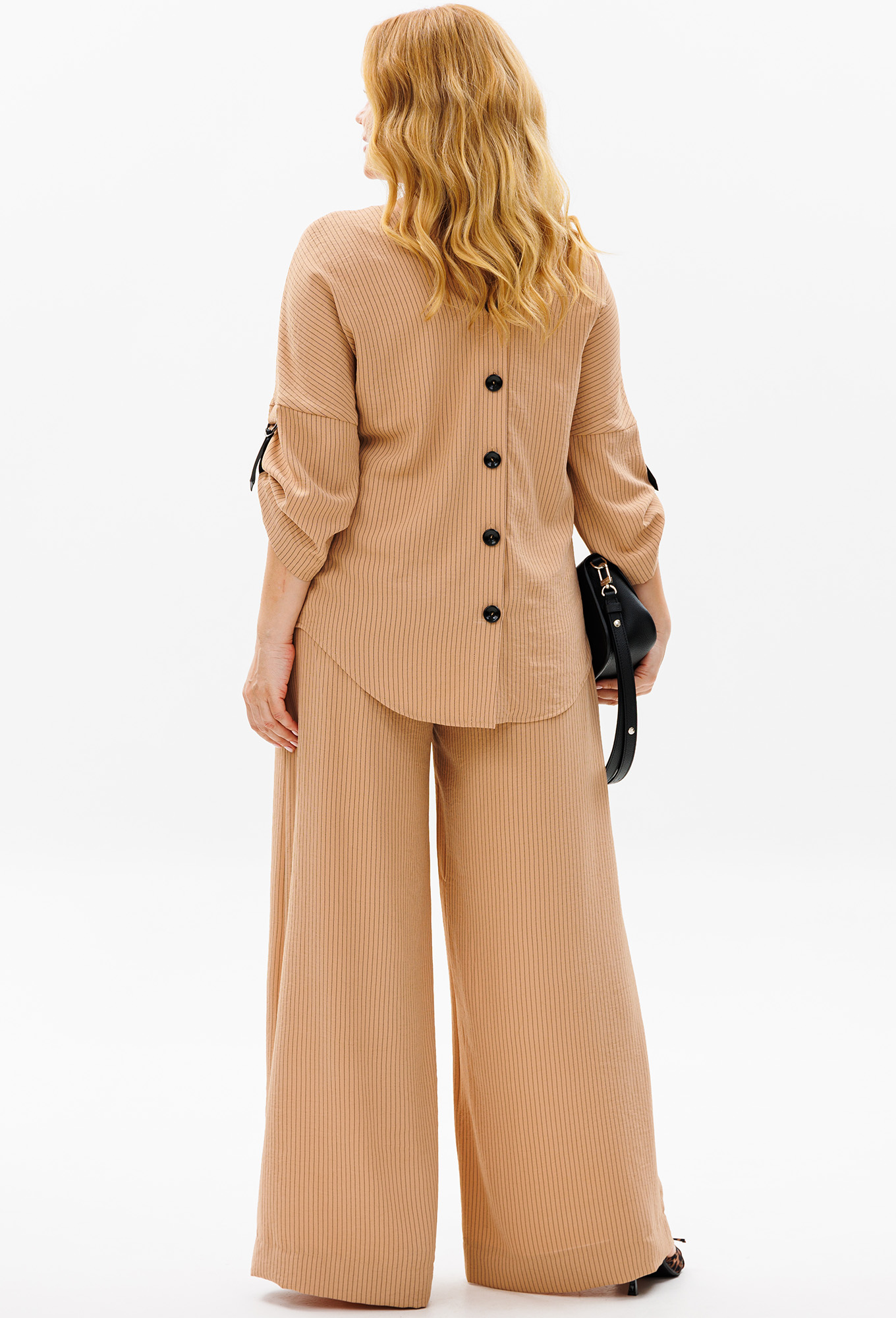 Модель: Мишель Шик 1374 бежевый Р..показатьост: 164 см (девушка на фото ростом 170см) Сезон: Весна-Лето Тип ткани: 95% полиэстер, 5% вискозаУниверсальный и удобный женский брючный комплект. Данный комплект может быть как нарядным, так и для повседневной носки. Изделие состоит из удлиненной блузы и брюк-палаццо. Блуза прямого свободного кроя выполнена из приятной на ощупь костюмно-плательной ткани средней плотности. Рукав 3/4, который можно регулировать стяжкой-патой, круглая горловина спереди, сзади v-образная. Спинка с центральной бортовой застежкой на пуговицы. Брюки-палаццо идеально сидят на любой фигуре, подчеркивая все достоинства и скрывая недостатки. Брюки свободного кроя, длинные, на притачном поясе с резинкой. По низу цельнокроеная манжета из широкой подгибки. По переду два кармана в боковых швах. С данным комплектом можно смело создавать стильные образы как вместе, так и по отдельности.