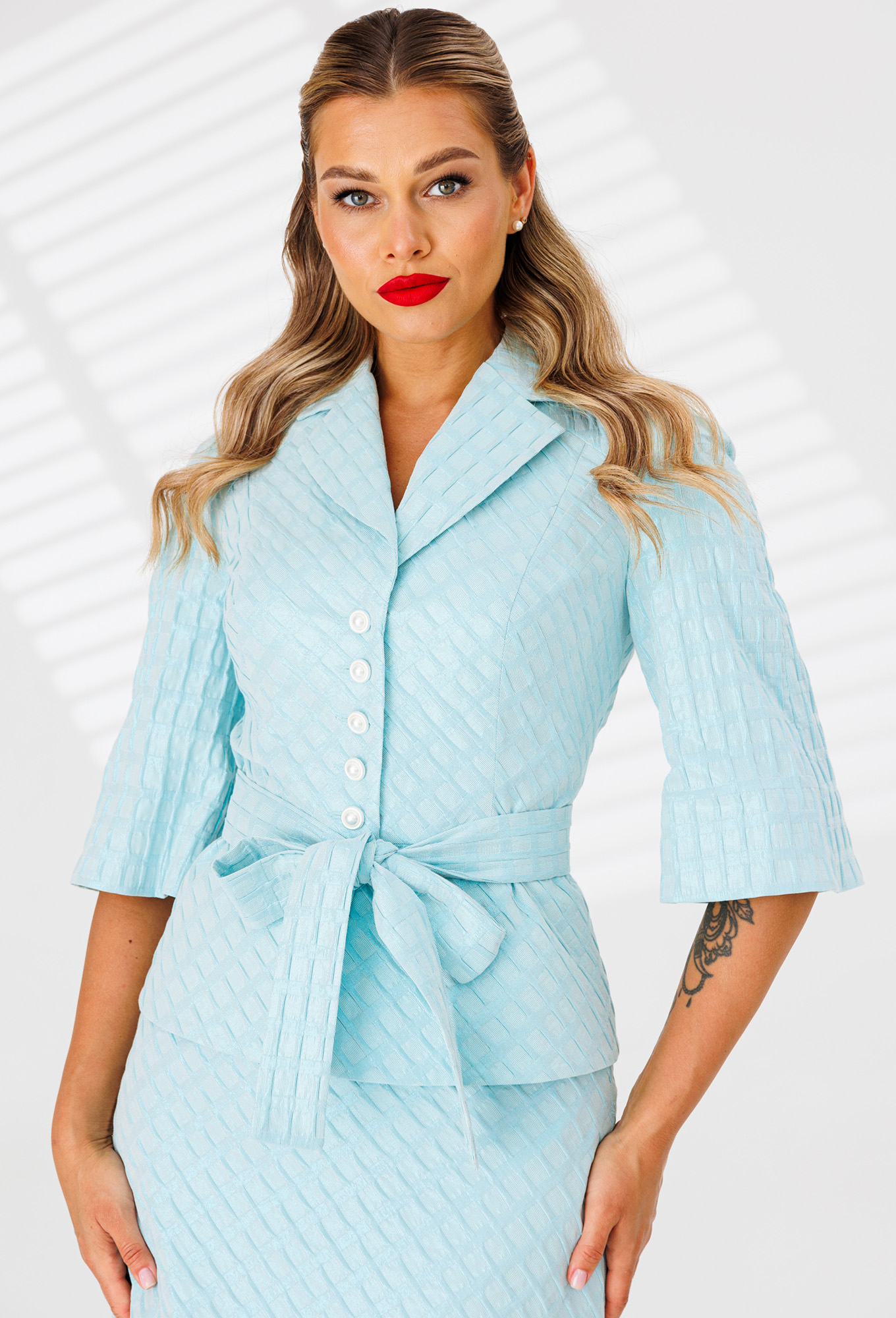 Модель: Мода Юрс 2618 бирюза Рост..показать: 164 см (девушка на фото ростом 170см) Сезон: Круглогодичный Тип ткани: Полиэстер 81%, люрекс 15%, эластан 4% (жаккард)Двухпредметный костюм, состоящий из жакета и юбки. Акцентом данного комплекта является съемный пояс. Для создания данного образа использовали жаккардовый однотонный материал. Жакет прилегающего силуэта, с отрезной баской по переду и спинка с рельефами. Рукав-реглан. Юбка А-силуэта на притачном поясе, сзади с резинкой. Застежка на тесьму-молнию в боковом шве. Костюм на подкладке.