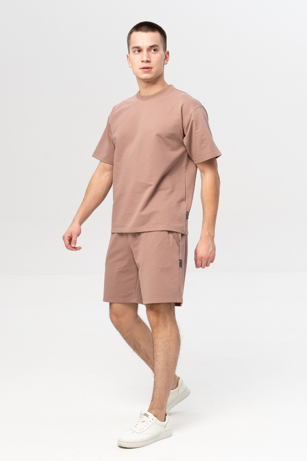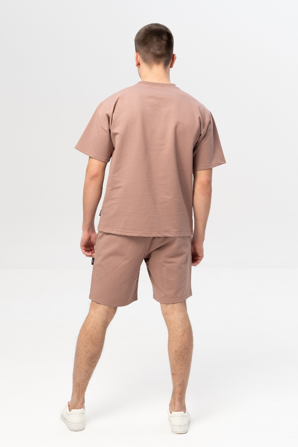 Мужской костюм из хлопкового футера, состоящий из футболки и шорт. Футболка оверсайз, чуть спущенное плечо, рукава короткие прямые, вырез горловины круглый. Шорты чуть выше колен объемные с карманами в боковых швах, с мягкой резинкой на талии и высокой комфортной посадкой и с регулируемым шнурком. Их универсальность позволяет прекрасно сочетаться с любым верхом.
