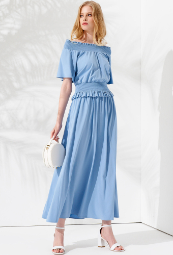 Модель: Панда 83710 голубой Рост:..показать 164 см (девушка на фото ростом 170см) Сезон: Весна-Лето Тип ткани: Блузка- Вискоза 95%, эластан 5%Юбка- Вискоза 95%, эластан 5%Комплект летний из блузы и длинной юбки решит извечную проблему с гармоничным сочетанием верха и низа. Женский костюм выполнен из вискозы, он легкий и струящийся. Блузка женская с рукавом-крылышком украшена по линии талии широкой резинкой. Аналогичная резинка проходит и по линии плеч, оголяя их. Блуза и длинная юбка, спадающая мягкими волнами, идеально сочетаются между собой.