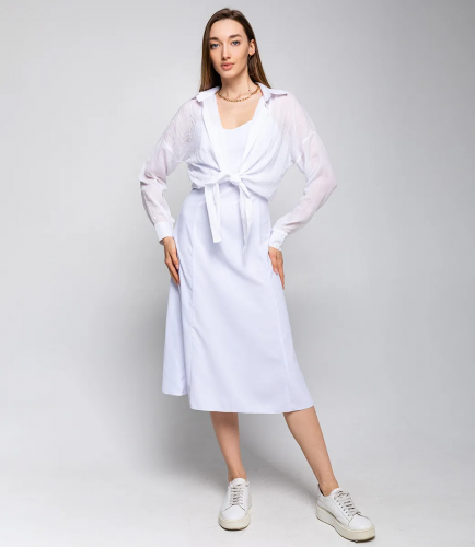 Чтобы вы были уверены в размере, мы предоставили на сайте таблицу. Воспользовавшись ею, вы сможете сами сделать мерки и убедиться. Предложенная нами цена является доступной и приемлемой. Подарите себе удовольствие быть элегантной и неповторимой в нашем легком летнем платье+рубашке! Рост модели 173 см., 84-58-89.