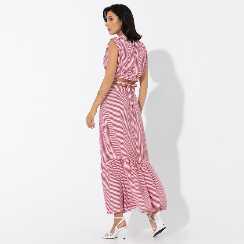 Ткань «полоска плательная» — это не просто материал, это воплощение комфорта и лёгкости. Она дарит ощущение невесомости, позволяя коже дышать даже в самый жаркий день. Удлинённый силуэт, который создаётся за счёт макси-юбки, подчёркивает грациозность и добавляет нотку аристократичности в ваш образ. Этот комплект станет вашим союзником в создании неповторимого стиля, который не останется незамеченным. Заказывая оптом, вы сможете предложить своим клиентам трендовые решения для летнего гардероба.
