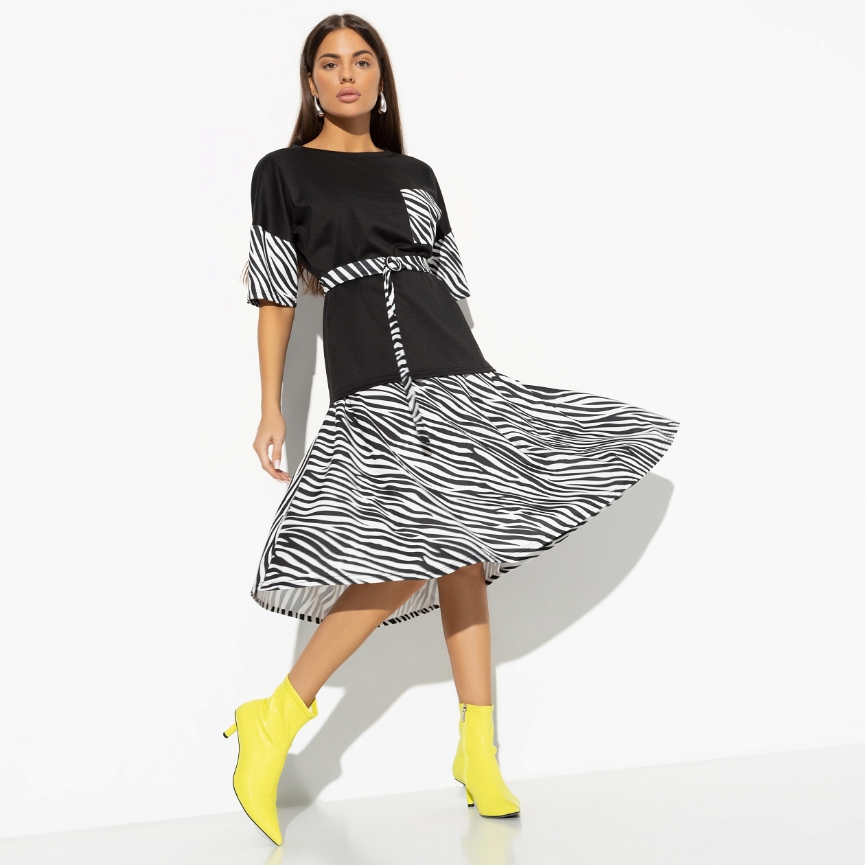 Черно-белый анималистичный принт — это вечный тренд, который подчёркивает характер и индивидуальность. Он легко сочетается с яркими акцентами, такими как красная помада или маникюр, делая образ ещё более выразительным. Этот комплект станет идеальным вариантом как для повседневных встреч с друзьями, так и для работы в офисе. Регулируемый пояс позволяет легко менять акценты в образе, делая его более свободным или подчеркивая талию, что привлекает внимание покупателей, желающих адаптировать комплект под разные настроения.