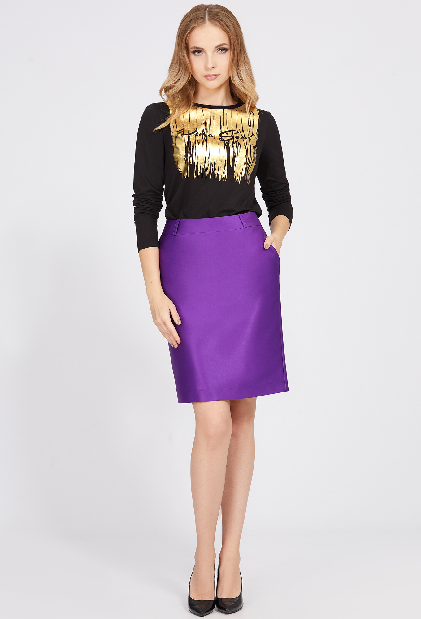 У юбки передняя половина с косыми карманами, в среднем шве задней половины юбки обработаны потайная молния и шлица. На подкладке.
